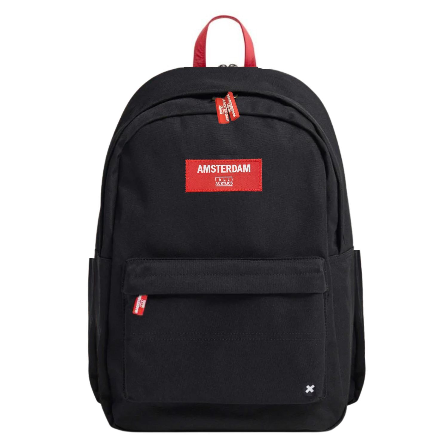 Sturdy black canvas Amsterdam backpack with 3 zip pockets and heavy duty zip closures