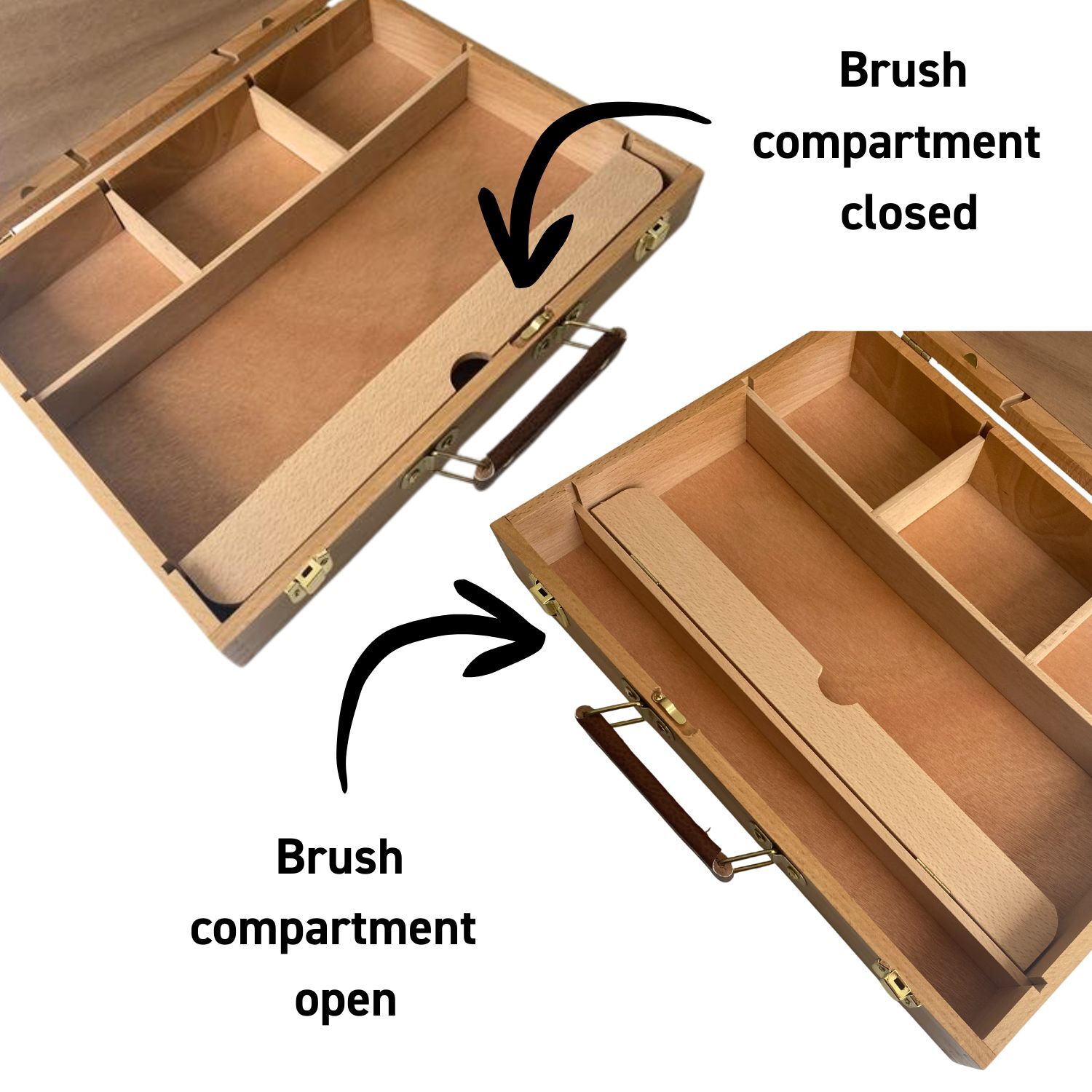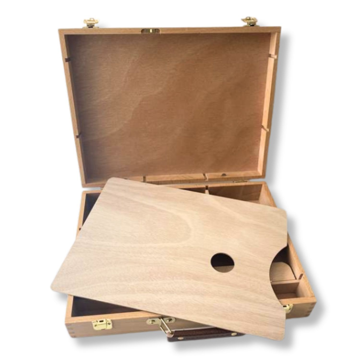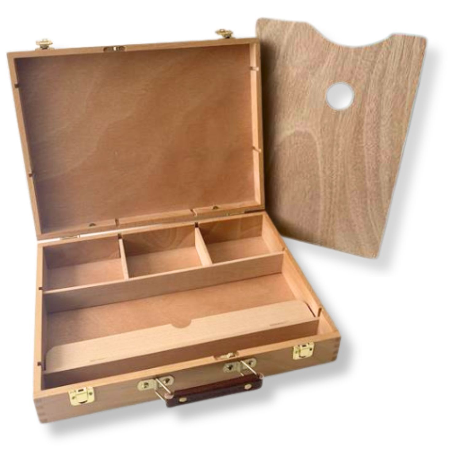 Designed with functionality in mind, the box features a timber hinged lid, secure metal clasps, and a comfortable carry handle for easy portability. Inside, two large compartments provide ample space for paints and brushes, while three smaller sections neatly hold accessories, mediums, or bottles. A full size timber painting palette is included, fitting perfectly within the lid for convenient use on the go.