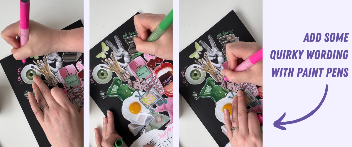 Now it's time to finish off your design by adding those last little quirky elements. We added some cursive typographic wording around parts of the collage design. We think they look really eye catching and fun!