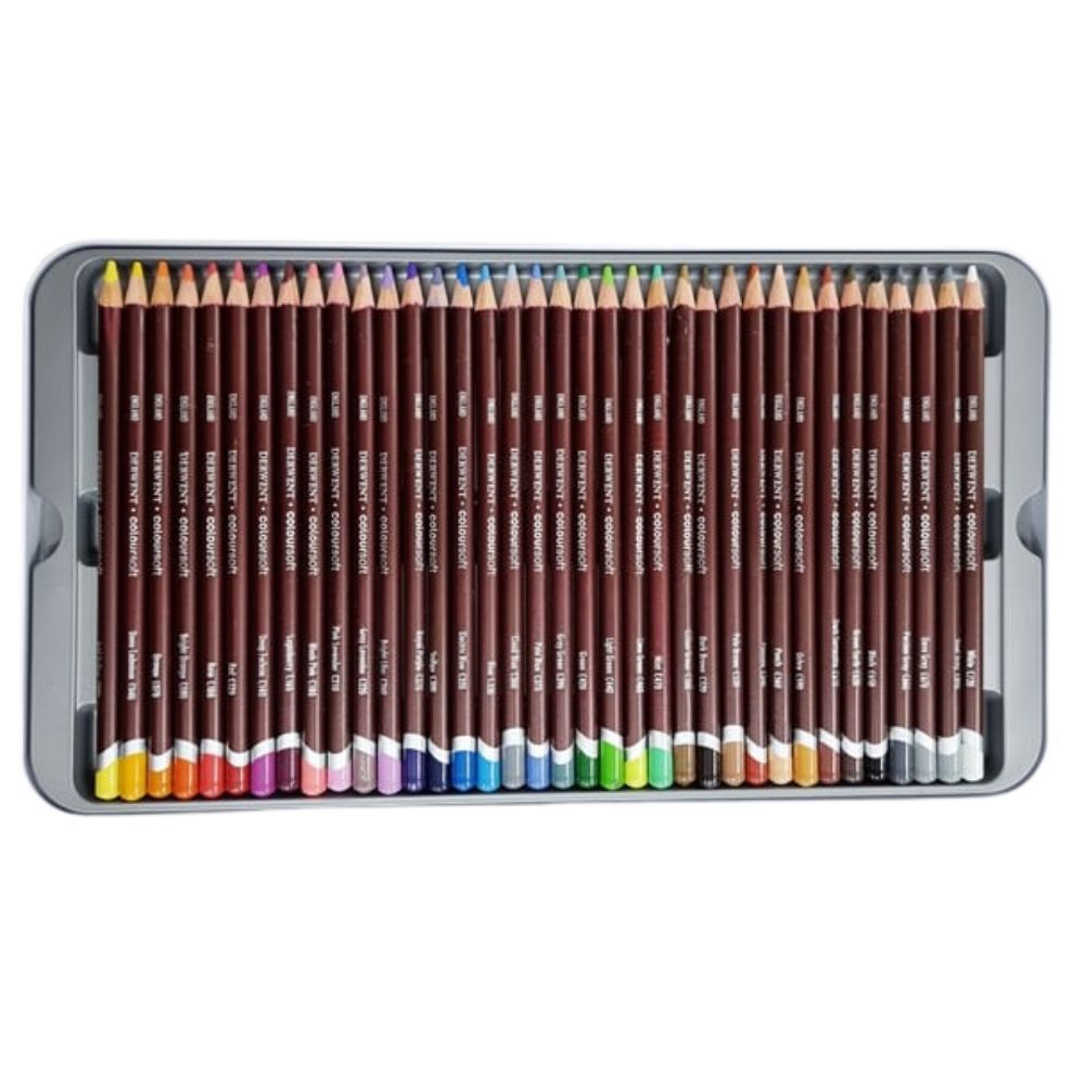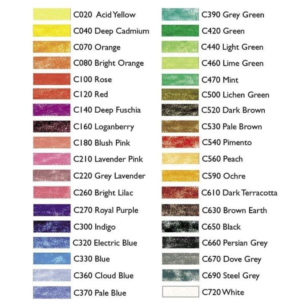 • 36 x Coloursoft pencils: Acid Yellow, Deep Cadmium, Orange, Bright Orange, Rose, Red, Deep Fuchsia, Loganberry, Blush Pink, Pink Lavender, Grey Lavender, Bright Lilac, Royal Purple, Indigo, Electric Blue, Blue, Cloud Blue, Pale Blue, Grey Green, Green, Light Green, Lime Green, Mint, Lichen Green, Dark Brown, Pale Brown, Pimento, Peach, Ochre, Dark Terracotta, Brown Earth, Black, Persian Grey, Dove Grey, Steel Grey and White.