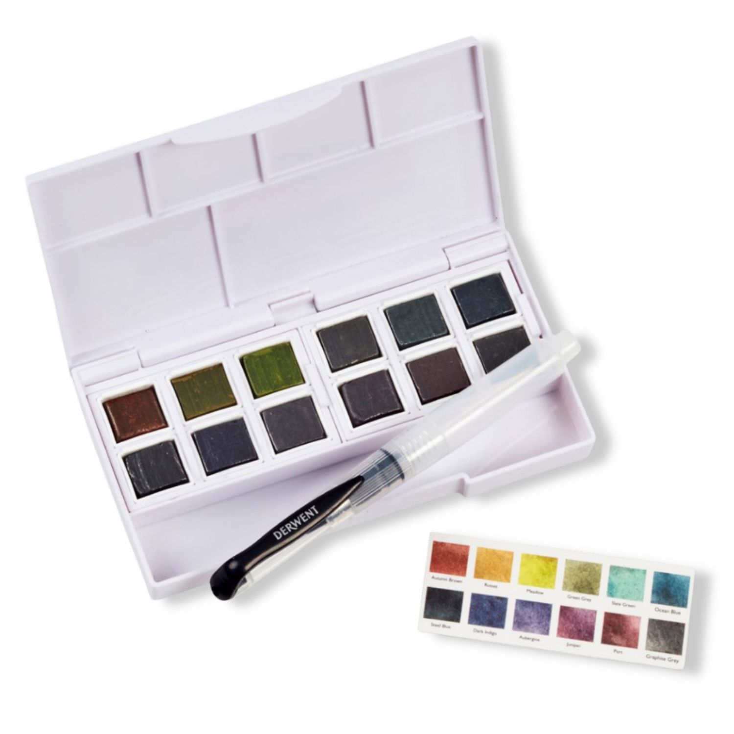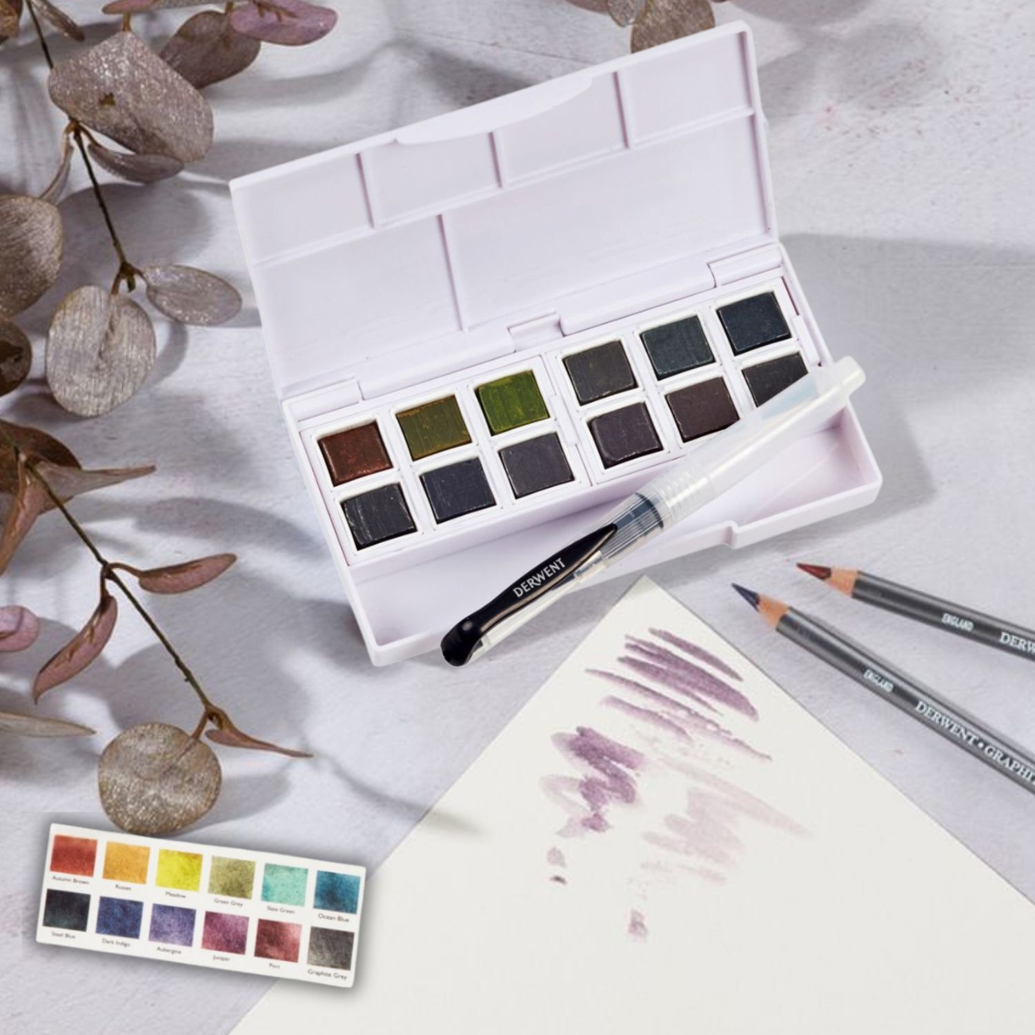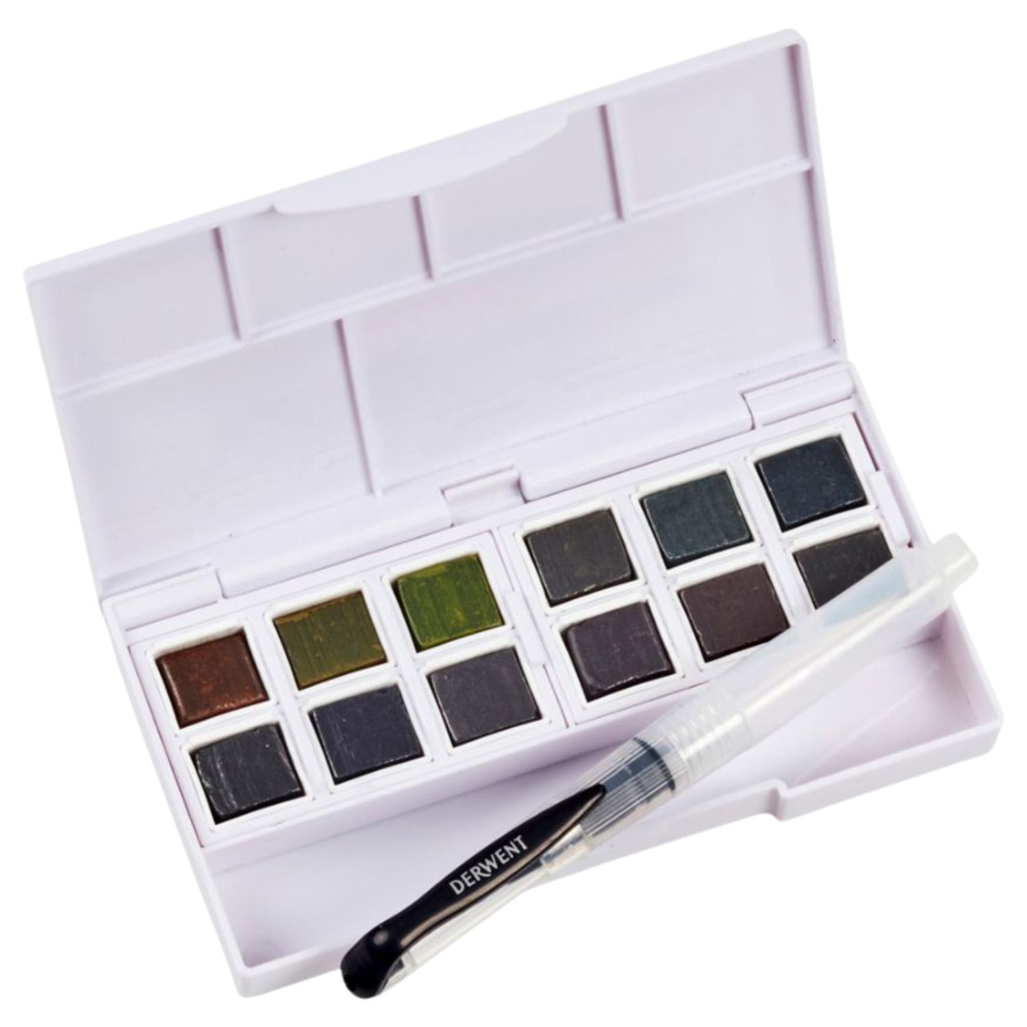 Combine the subtle elegance of graphite with the versatility of watercolour in the Derwent Graphitint 12 Pan Paint Travel Set. This portable set features 12 unique water-soluble paints that transform from soft graphite tones into gentle, translucent washes when water is added, giving your artwork a sophisticated tonal range.