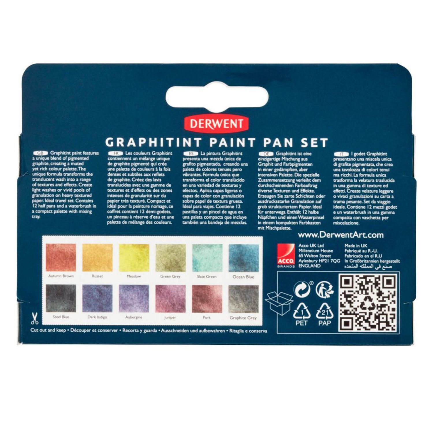 12 Graphitint paint pans: Autumn Brown, Russet, Meadow, Green Grey, Slate Green, Ocean Blue, Steel Blue, Dark Indigo, Aubergine, Juniper, Port, and Graphite Grey.