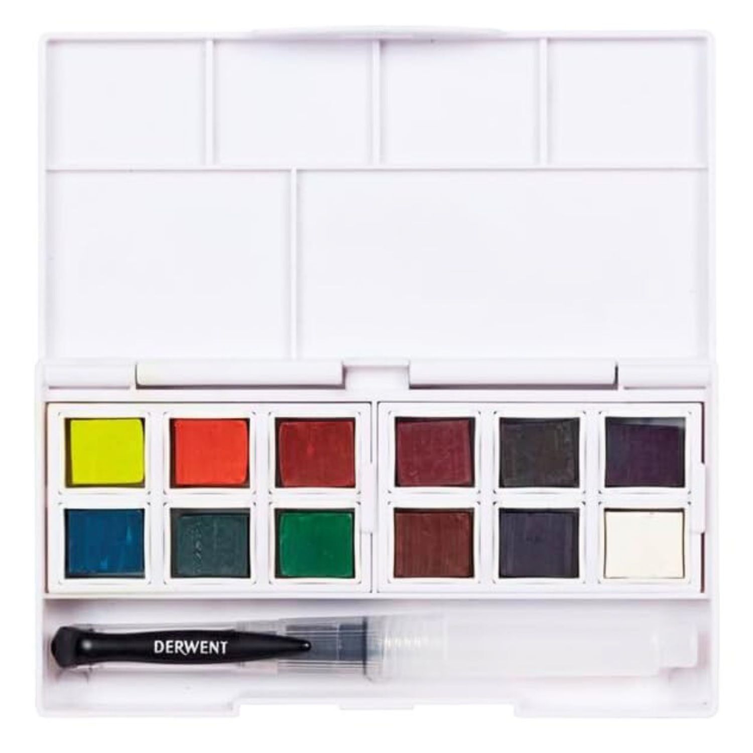 Derwent Watercolour Paint Pan Set 12 Colours + Water Brush