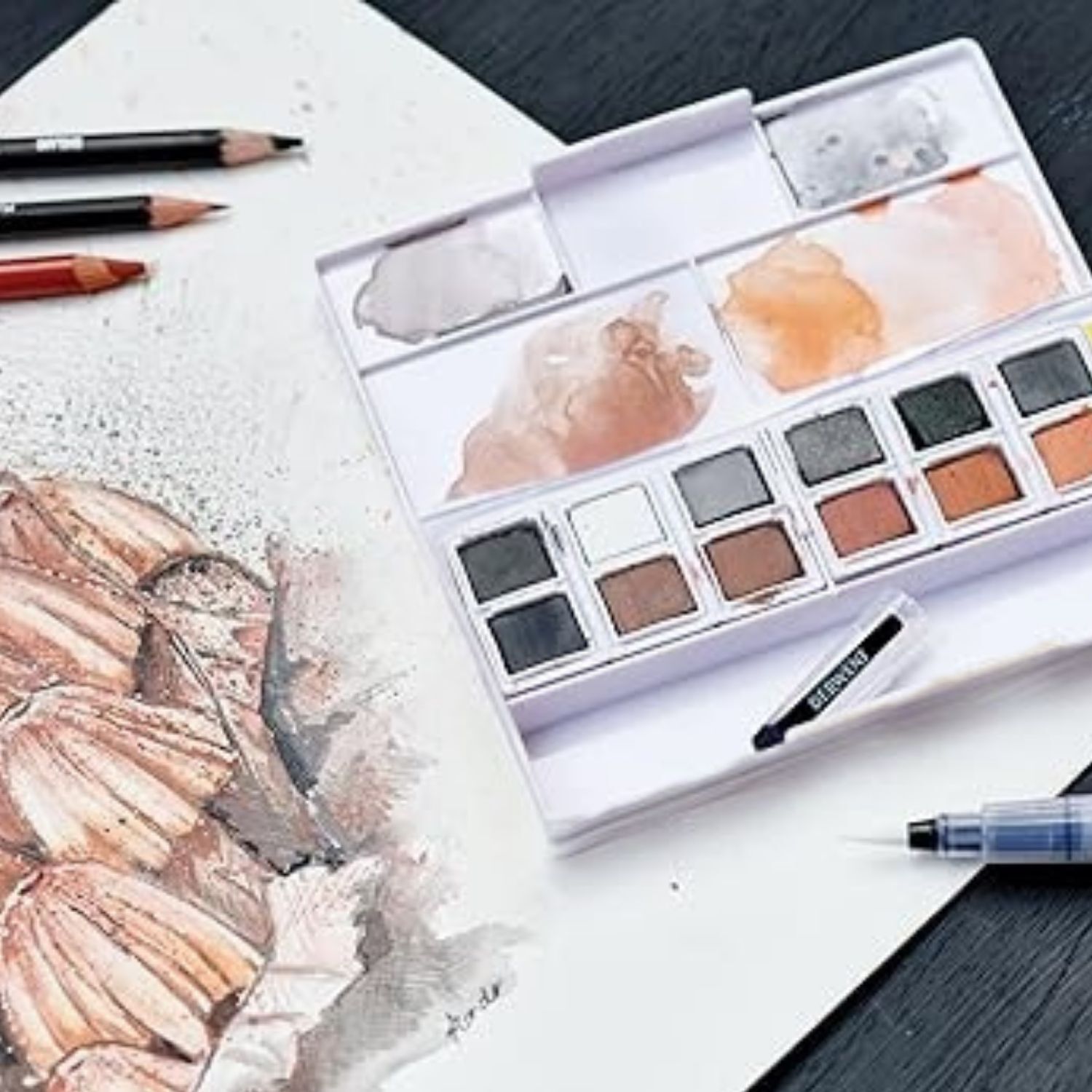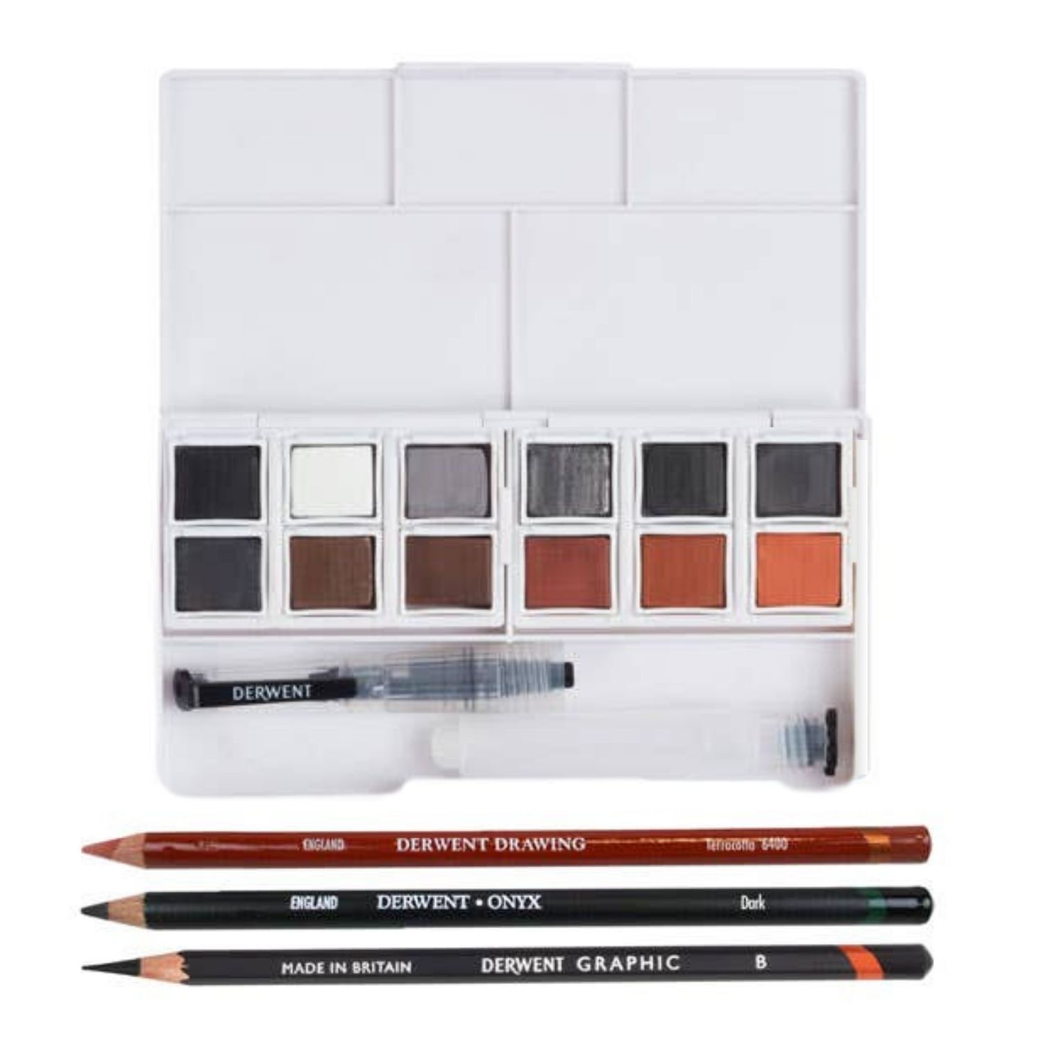 The compact travel-friendly tin includes 12 watercolour pans, 3 matching pencils, a Derwent water brush, and a built-in mixing palette, providing everything you need to experiment with shading, layering, and tonal variations in your artwork.
