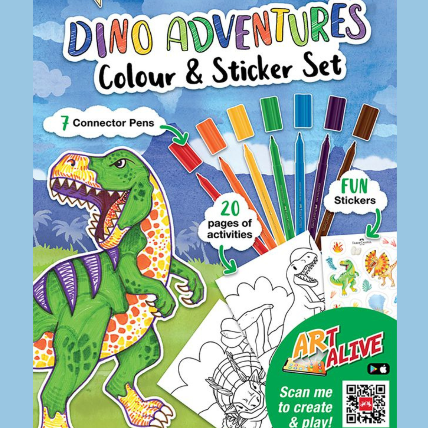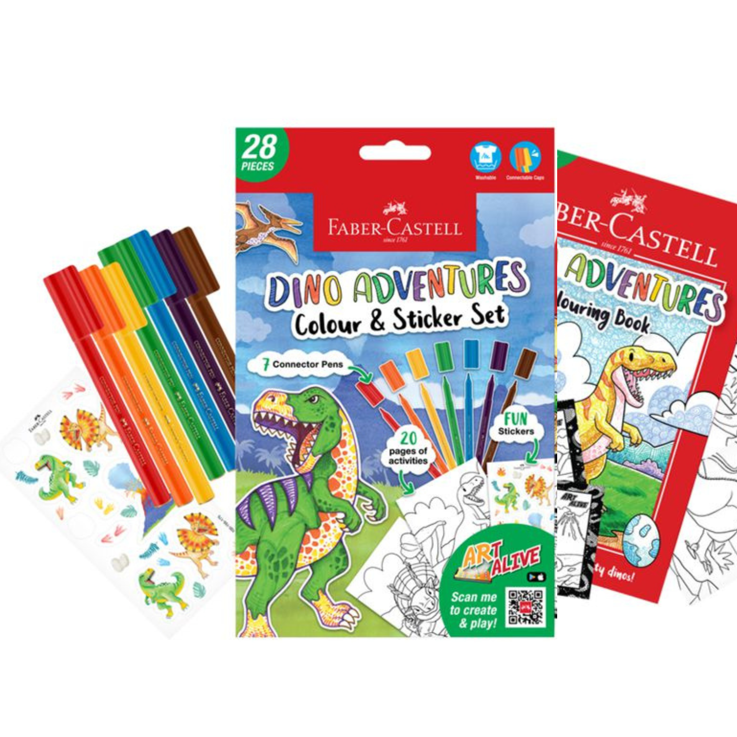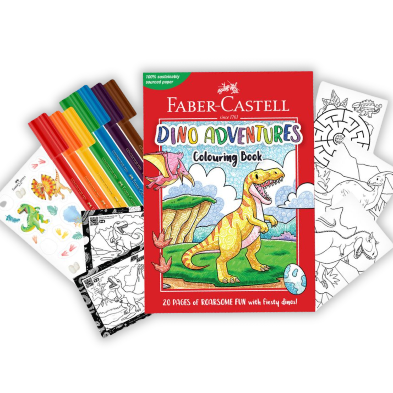 Roar into creativity with the Faber-Castell Colour & Sticker Set A5 – Dino Adventures (28pc). Perfect for young dinosaur fans, this fun activity set is packed with colouring pages, stickers, and vibrant colouring tools that inspire imagination and creative play. Kids can bring prehistoric scenes to life as they colour, decorate, and explore a world full of dinosaurs — all in a compact A5 size that’s perfect for travel or home.