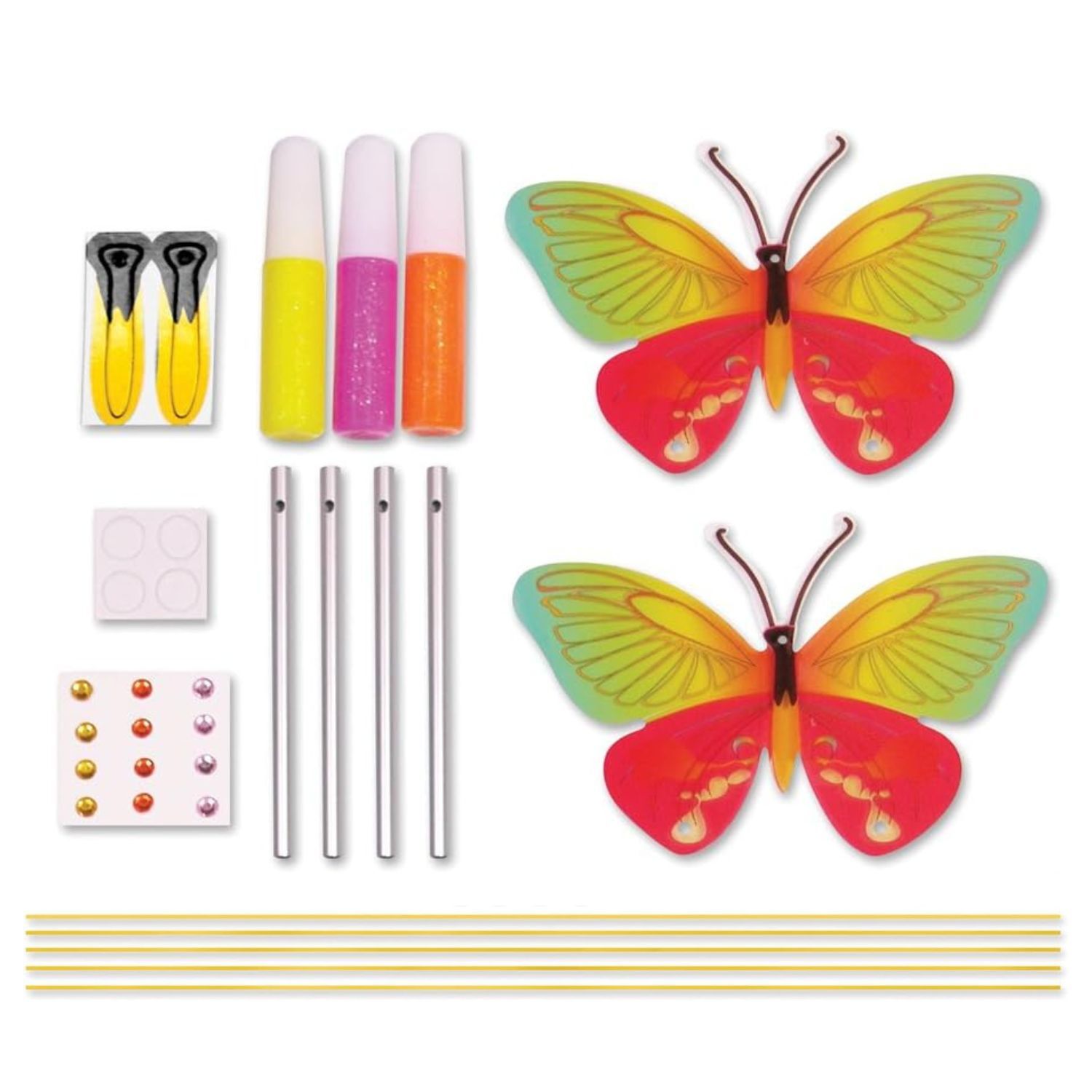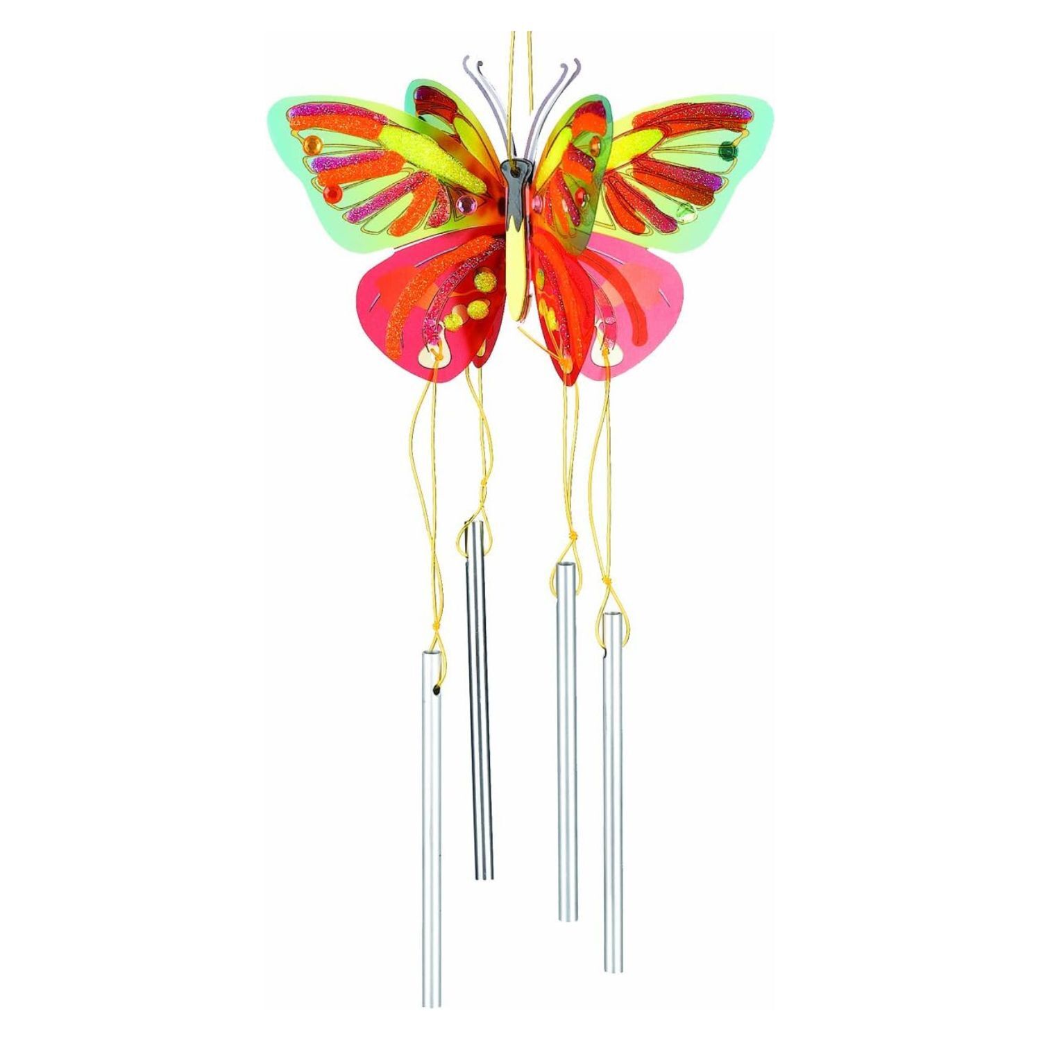 Kid tested! This beautiful butterfly wind chime comes with everything you need to create Kit includes: cardstock body, metal wind chimes, acetate butterfly wings, paint and gel cord for hanging.