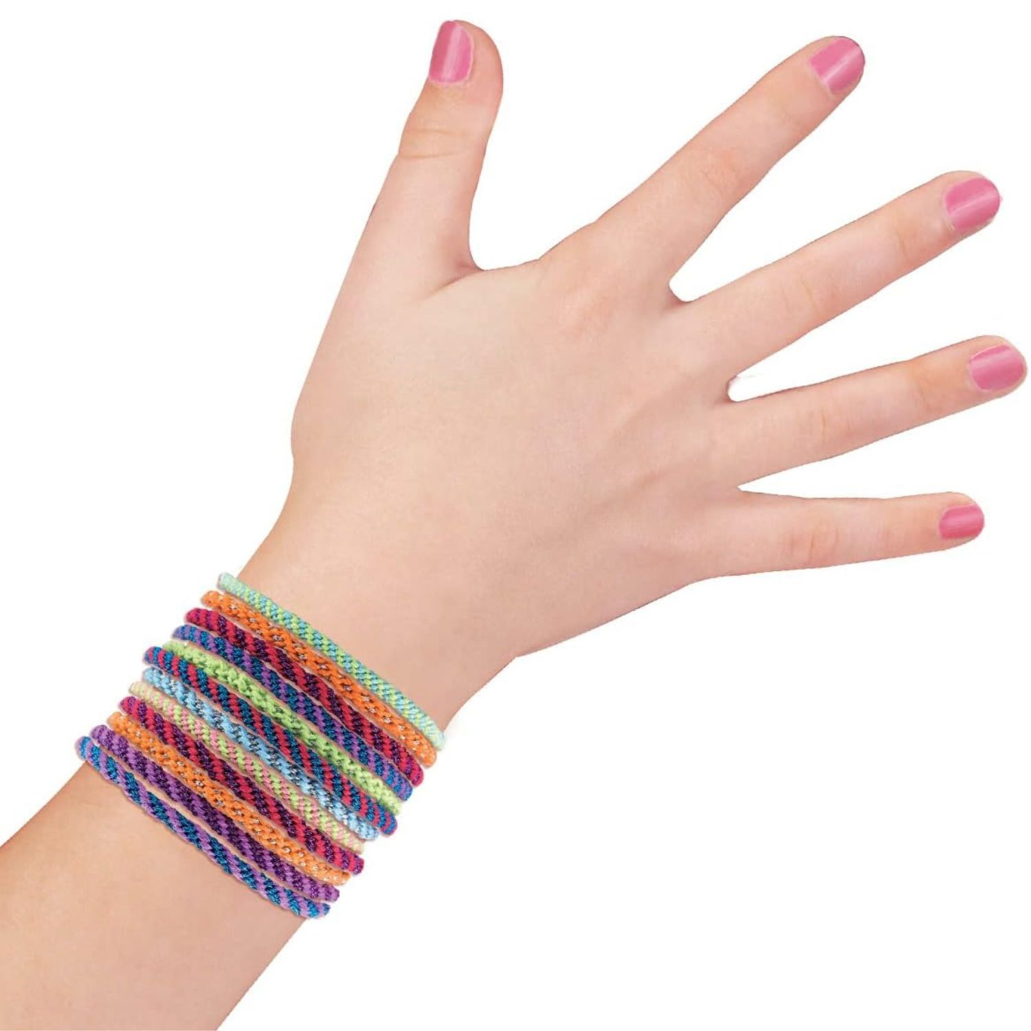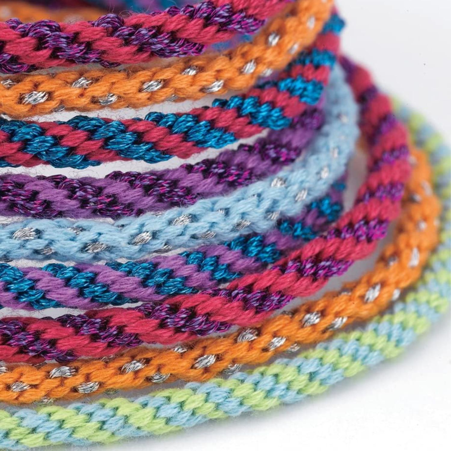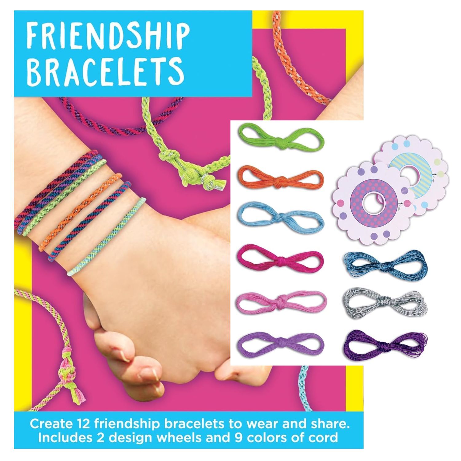 Create 12 woven friendship bracelets. Includes two foam weaving wheels, and six colours of embroidery floss.