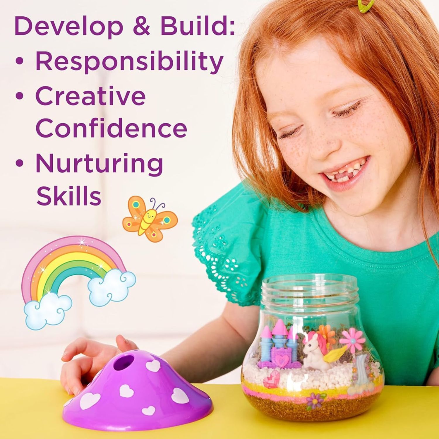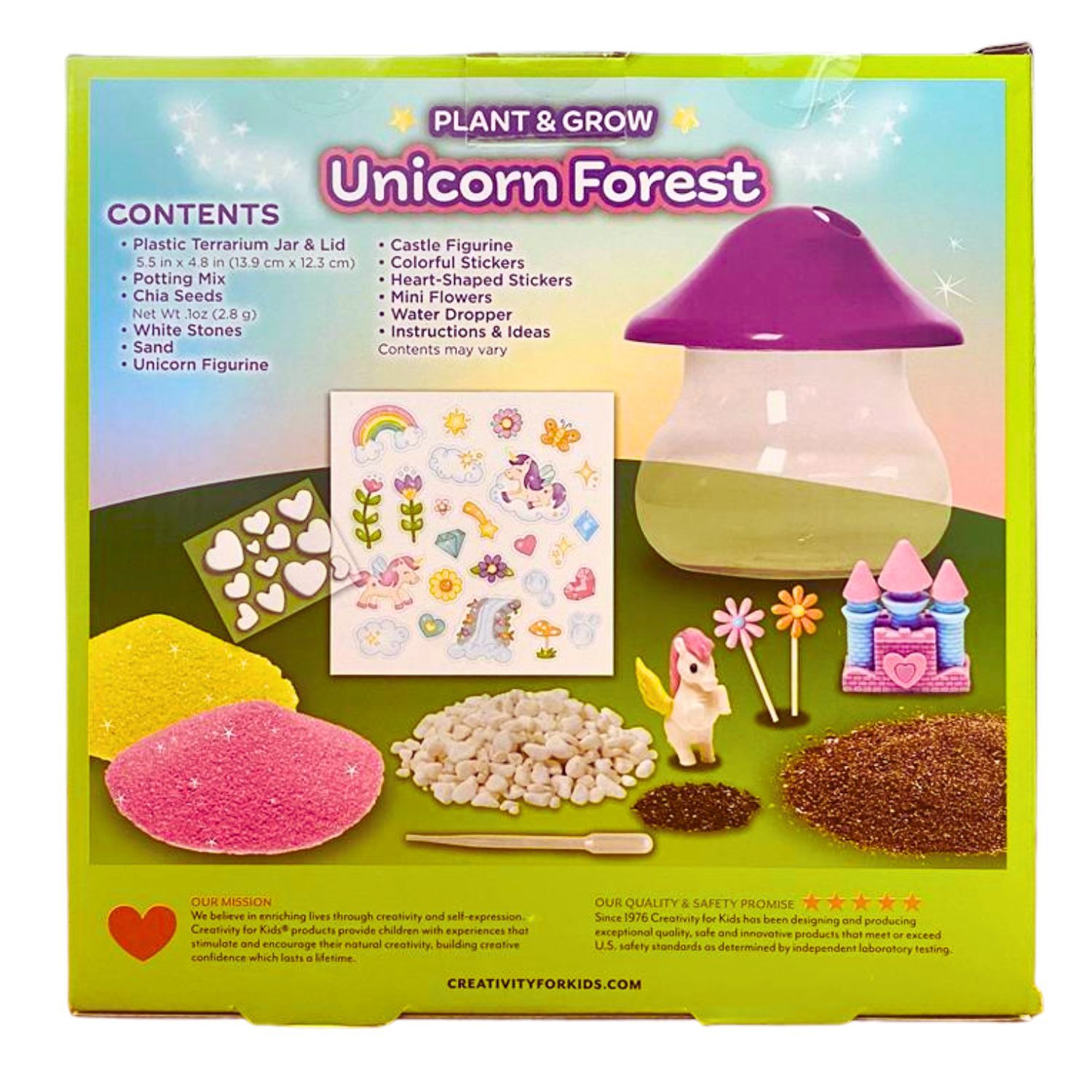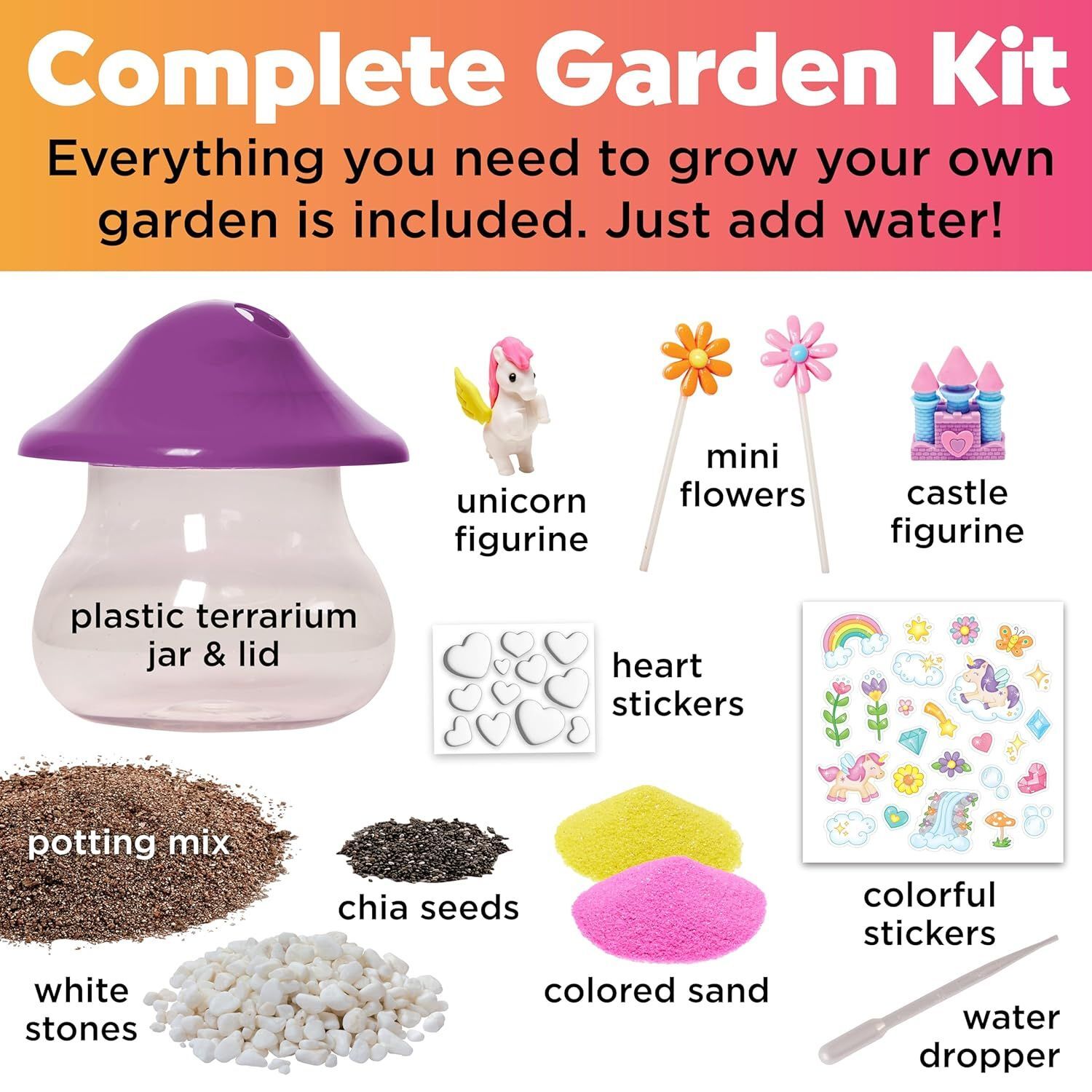 • Includes a unicorn, rainbow, castle, colourful sand, and planting materials