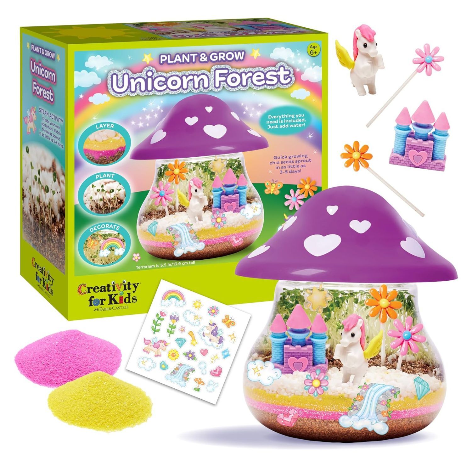 • Grow your own enchanted unicorn forest with sand, chia seeds, and decorations