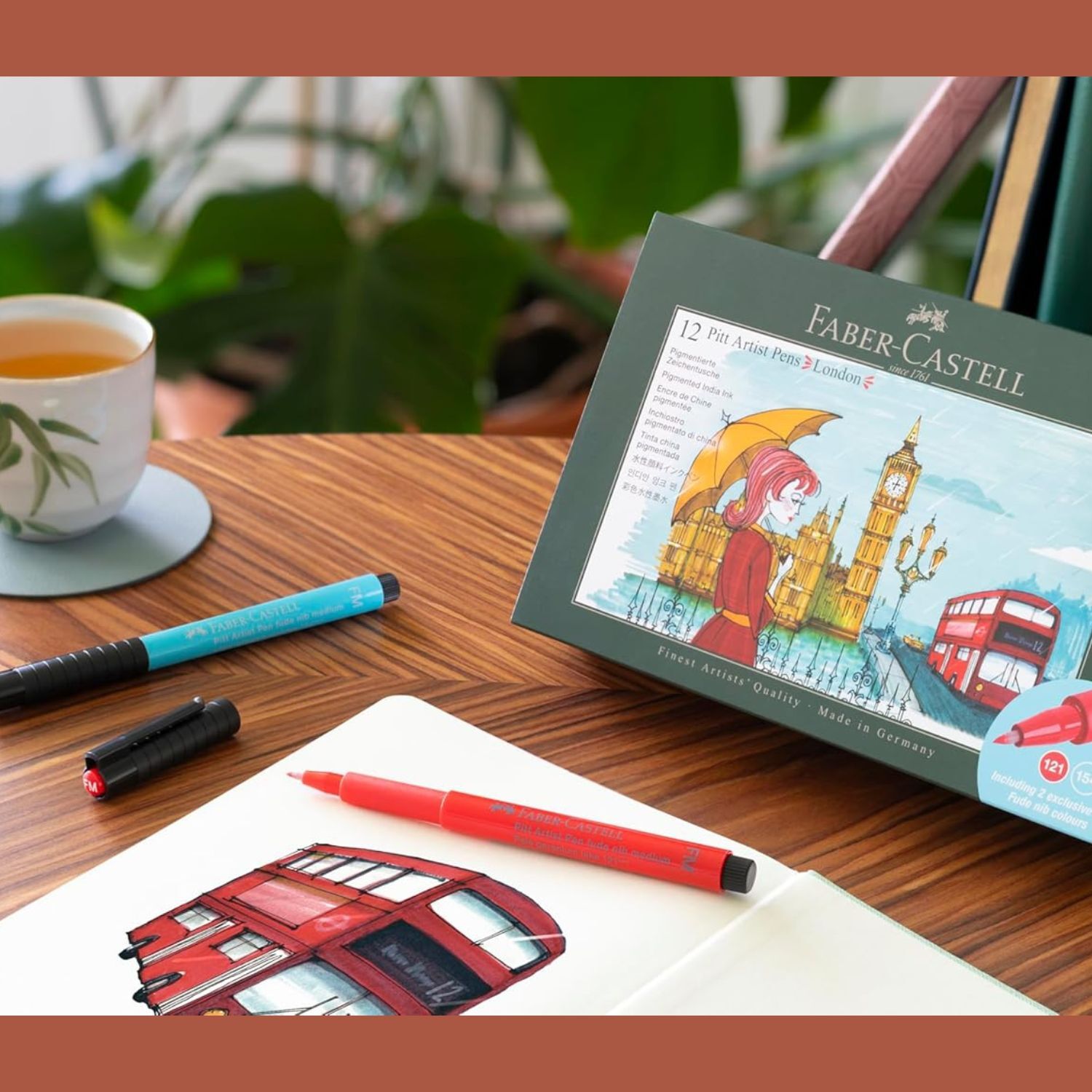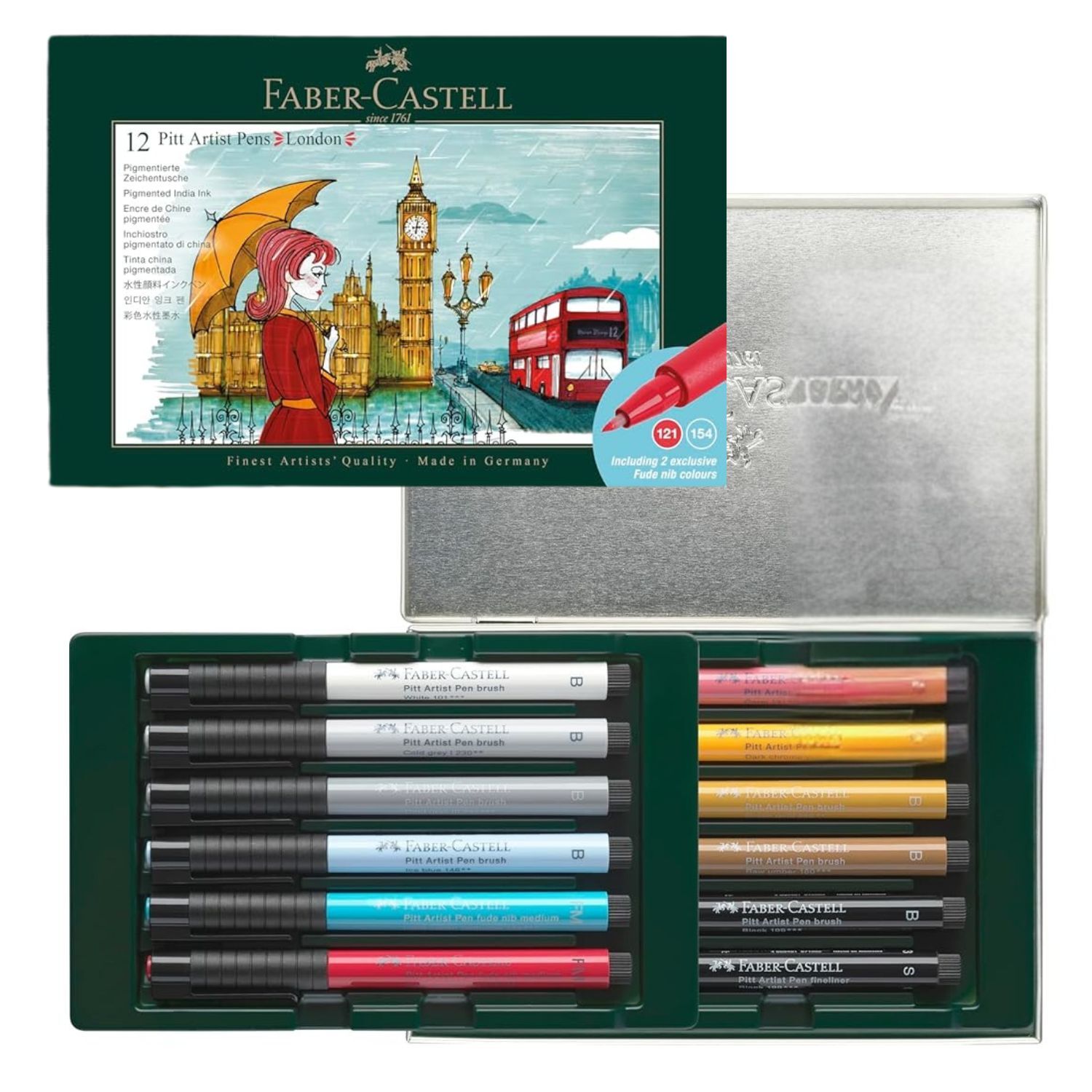 Bring a touch of London’s creative edge to your studio with the Faber-Castell India Ink Pitt Artist Pen Set – London. This set features a bold and balanced colour palette inspired by the city’s iconic mix of classic and contemporary style — from misty greys and muted tones to pops of vibrant colour.