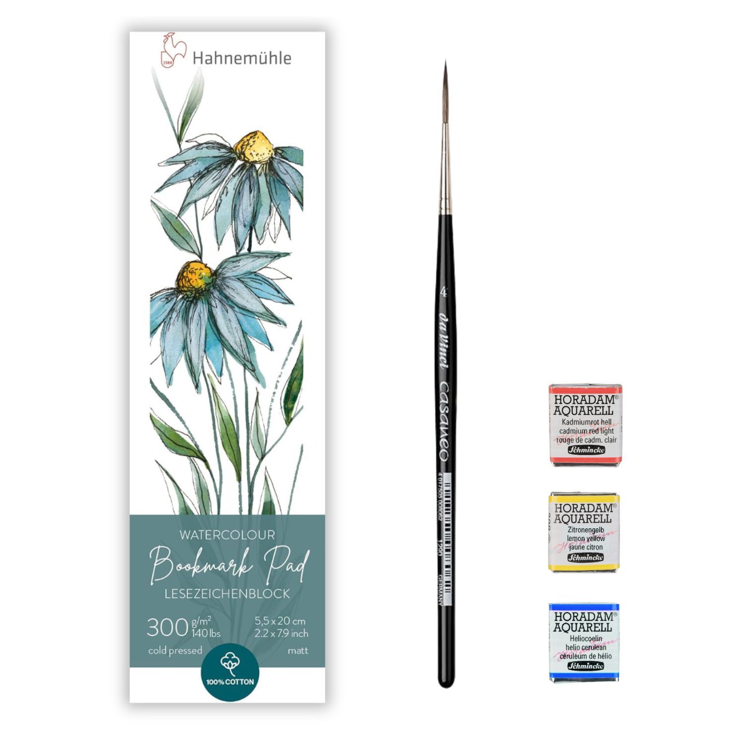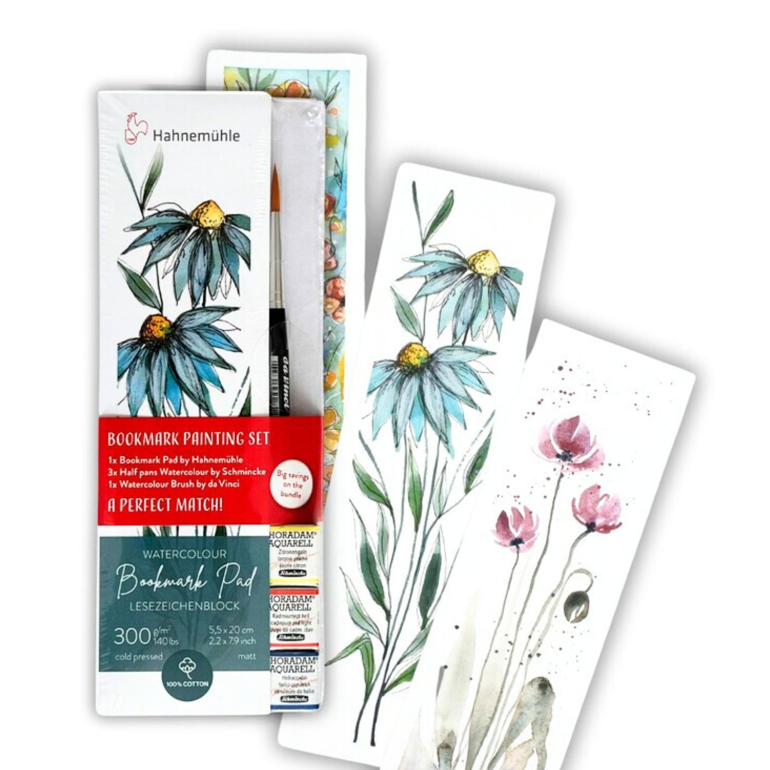 Get inspired and start painting right away with the Hahnemühle Watercolour Bookmark Pad Set, a premium creative kit for book lovers and artists alike. This beautifully curated set includes the Hahnemühle 300gsm 100% cotton Bookmark Pad, 3 Schmincke Horadam watercolour paint pans, and a Da Vinci watercolour brush, giving you everything you need to create stunning, personalised bookmarks straight out of the box.