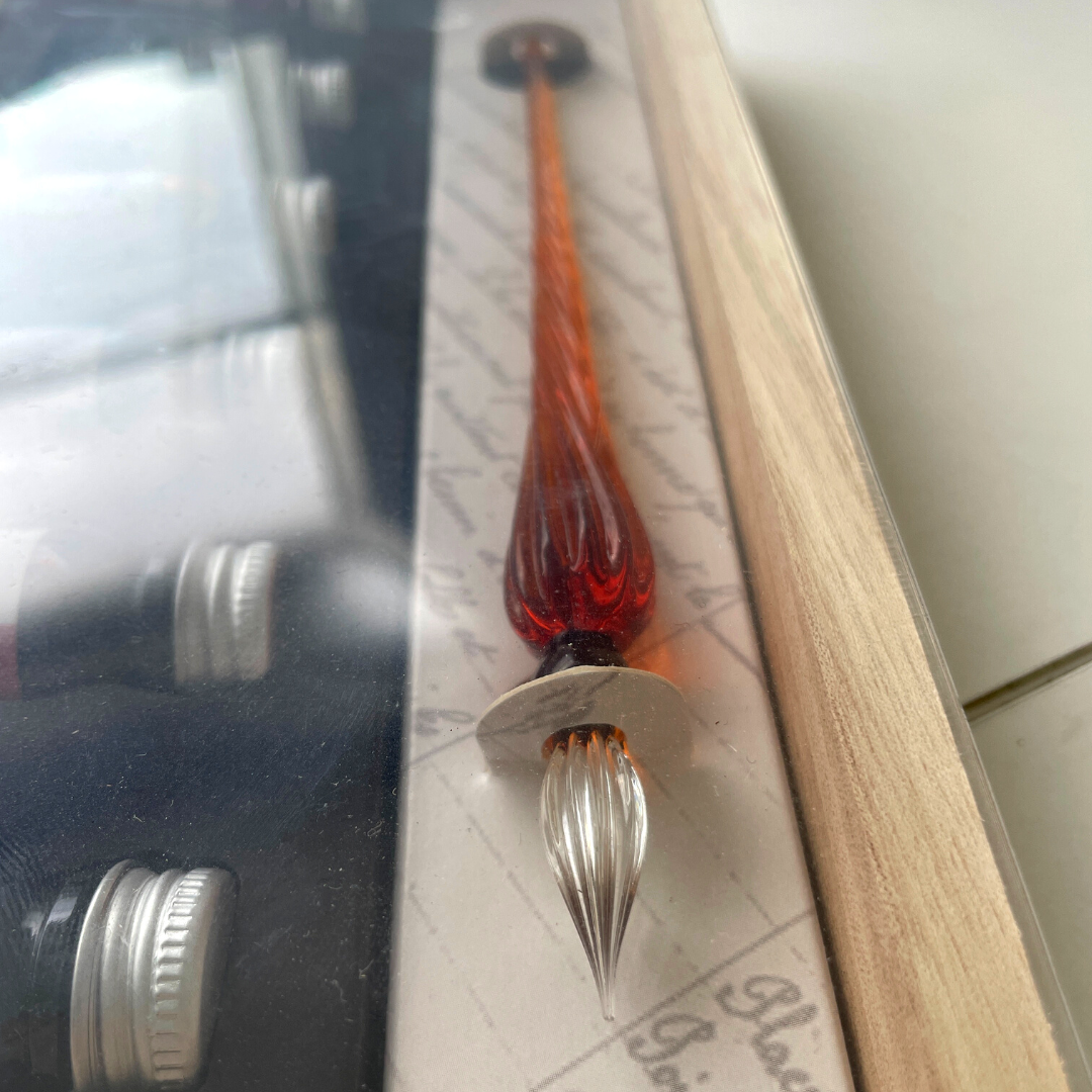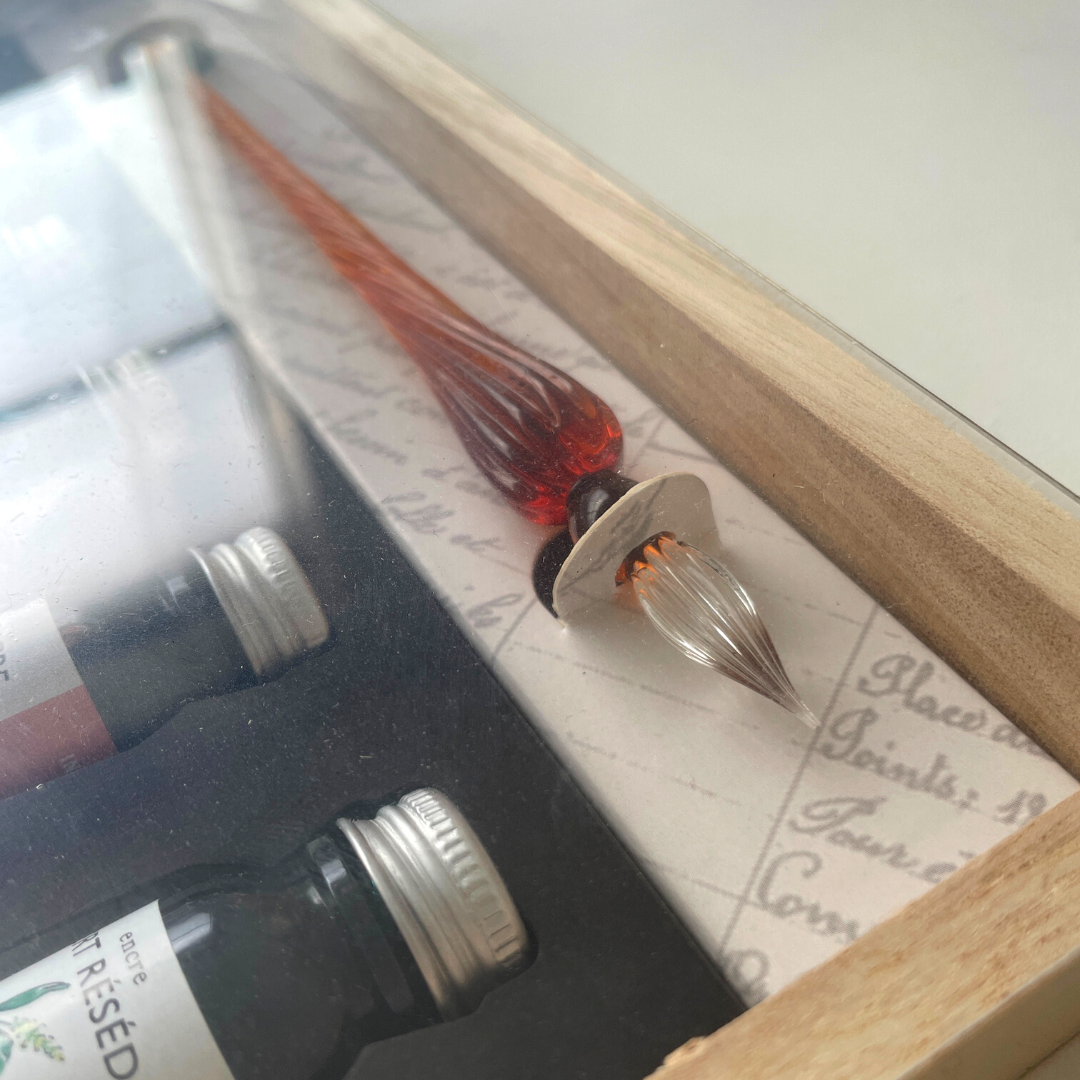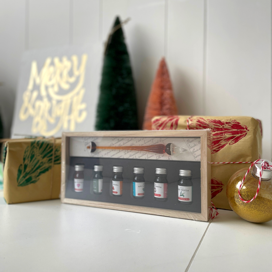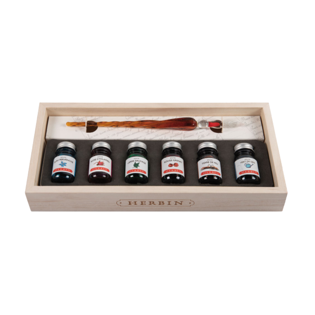 The Herbin Dip Pen & 6 Ink Set In Wooden Box is a beautiful wooden box containing a Spiral Glass Dip Pen and one 10ml bottle of Herbin ink each in Periwinkle Blue, Rose Cyclamen, Wild Ivy, Garnet Red, Land of Fire (brown) and Green Grey.