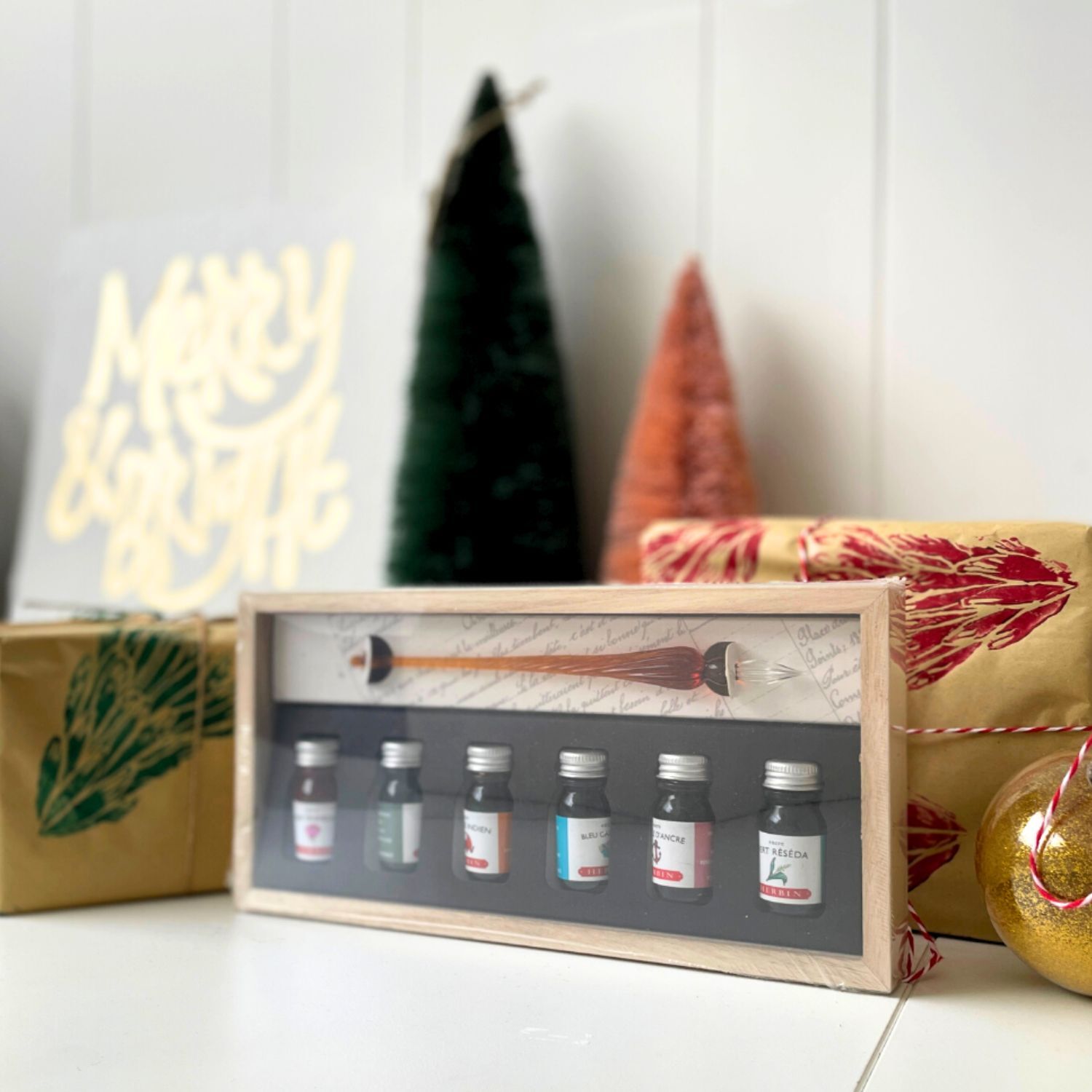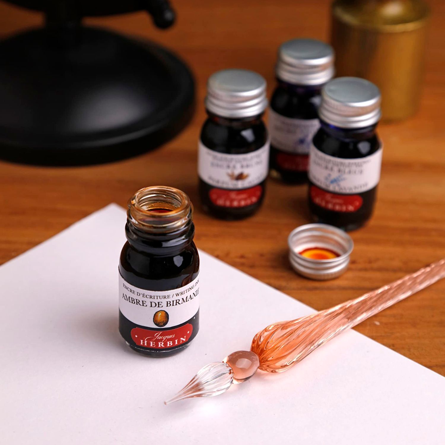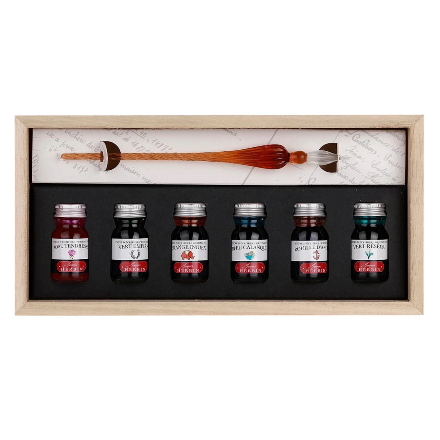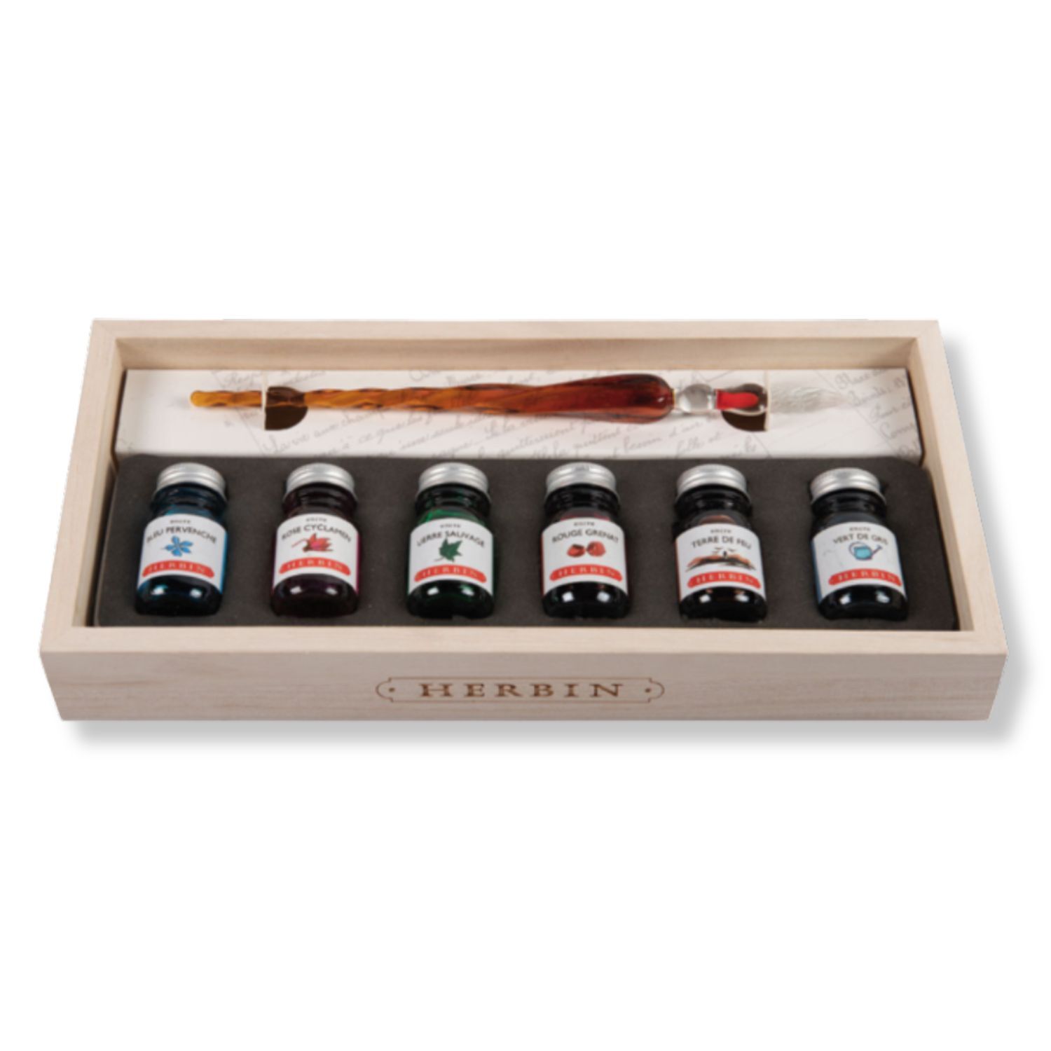 Herbin Glass Dip Pen & 6 Ink Set In Wooden Box