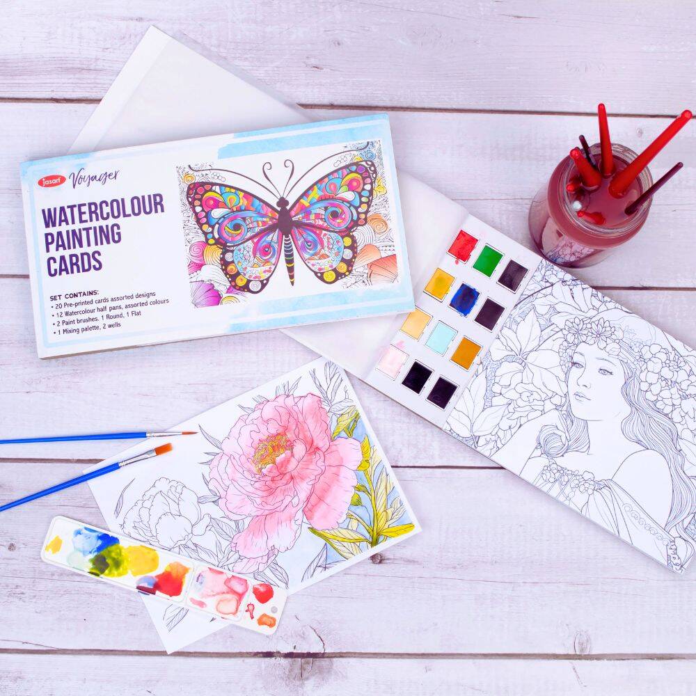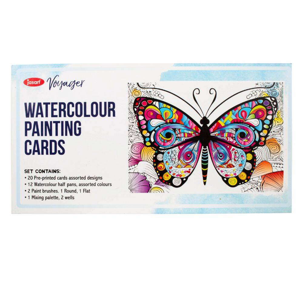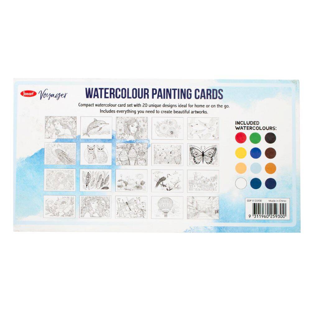 Jasart Voyager Watercolour Painting Cards contain 20 designs preprinted on watercolour paper, 12 watercolour half pans, 2 paint brushes and a mixing palette. Ideal for using at home or while travelling. The set includes everything you need to create beautiful artworks.