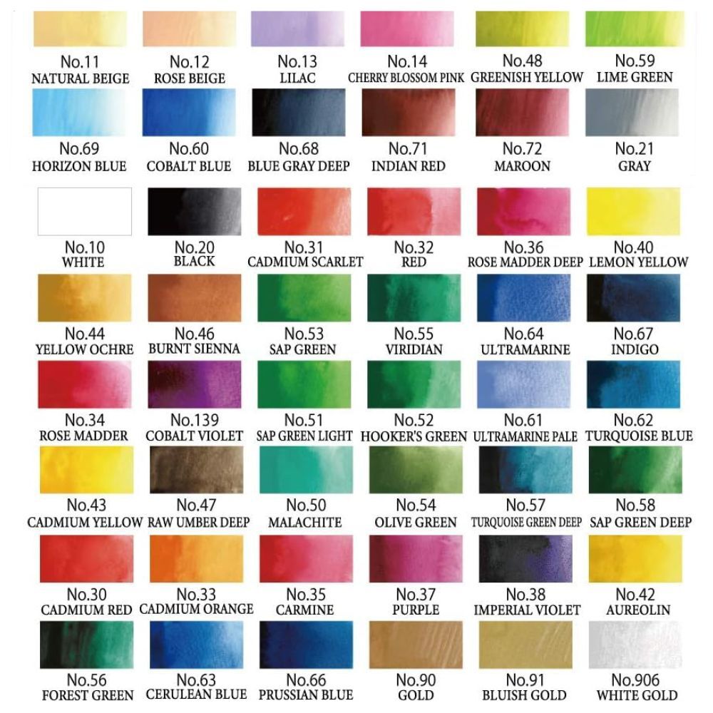 48 x Individual Pans: White (No. 10),Natural Beige (No.11 ),Rose Beige (No. 12 ), Lilac (No.13), Cherry Blossom Pink (No.14), Black (No. 20), Gray (No. 21), Cadmium Red (No. 30), Cadmium Scarlet (No.31), Red (No. 32), Cadmium Orange (No.33), Rose Madder (No. 34), Carmine (No. 35),Rose Madder Deep (No. 36), Purple (No. 37), Imperial Violet (No. 38), Cobalt Violet (No. 139), Cadmium Yellow (No. 43), Aureolin (No. 42), Lemon Yellow (No. 40), Yellow Ochre (No. 44), Burnt Sienna (No. 46), Raw Umber Deep (No. 47), Greenish Yellow (No. 48), Malachite (No. 50), Sap Green Light (No. 51), Hooker's Green (No. 52), Sap Green (No. 53), Olive Green (No. 54), Viridian (No. 55), Forest Green (No. 56), Turquoise Green Deep (No. 57), Sap Green Deep (No. 58), Lime Green (No. 59), Cobalt Blue (No. 60), Ultramarine Pale (No. 61), Turquoise Blue (No. 62), Cerulean Blue (No. 63), Prussian Blue (No. 66), Ultramarine (No. 64), Indigo (No. 67), Blue Gray Deep (No. 68), Horizon Blue (No. 69), Indian Red (No. 71), Maroon (No. 72), Gold (No. 90), Bluish Gold (No. 91), and White Gold (No. 906).
