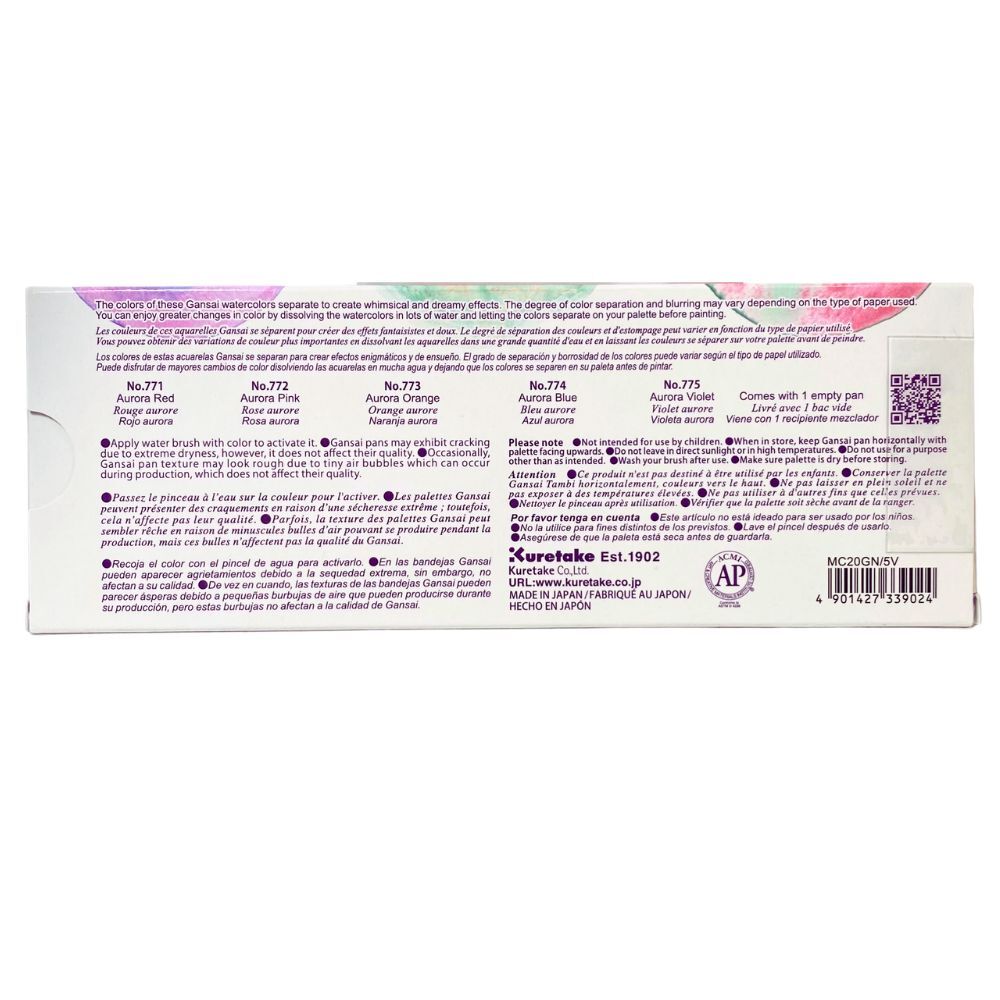 5 x Individual Pans: (771) Aurora Red, (772) Aurora Pink, (773) Aurora Orange, (774) Aurora Blue and (775) Aurora Violet and one empty pan for mixing