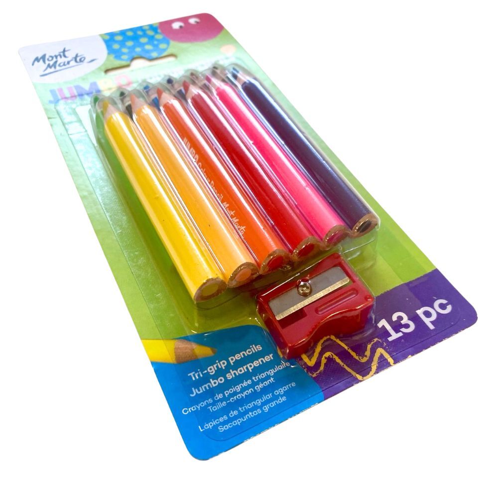 • 12 Jumbo pencils in bright colours - Yellow, Light Pink, Orange, Red, Pink, Purple, Light Blue, Dark Blue, Light Green, Dark Green, Brown and Black