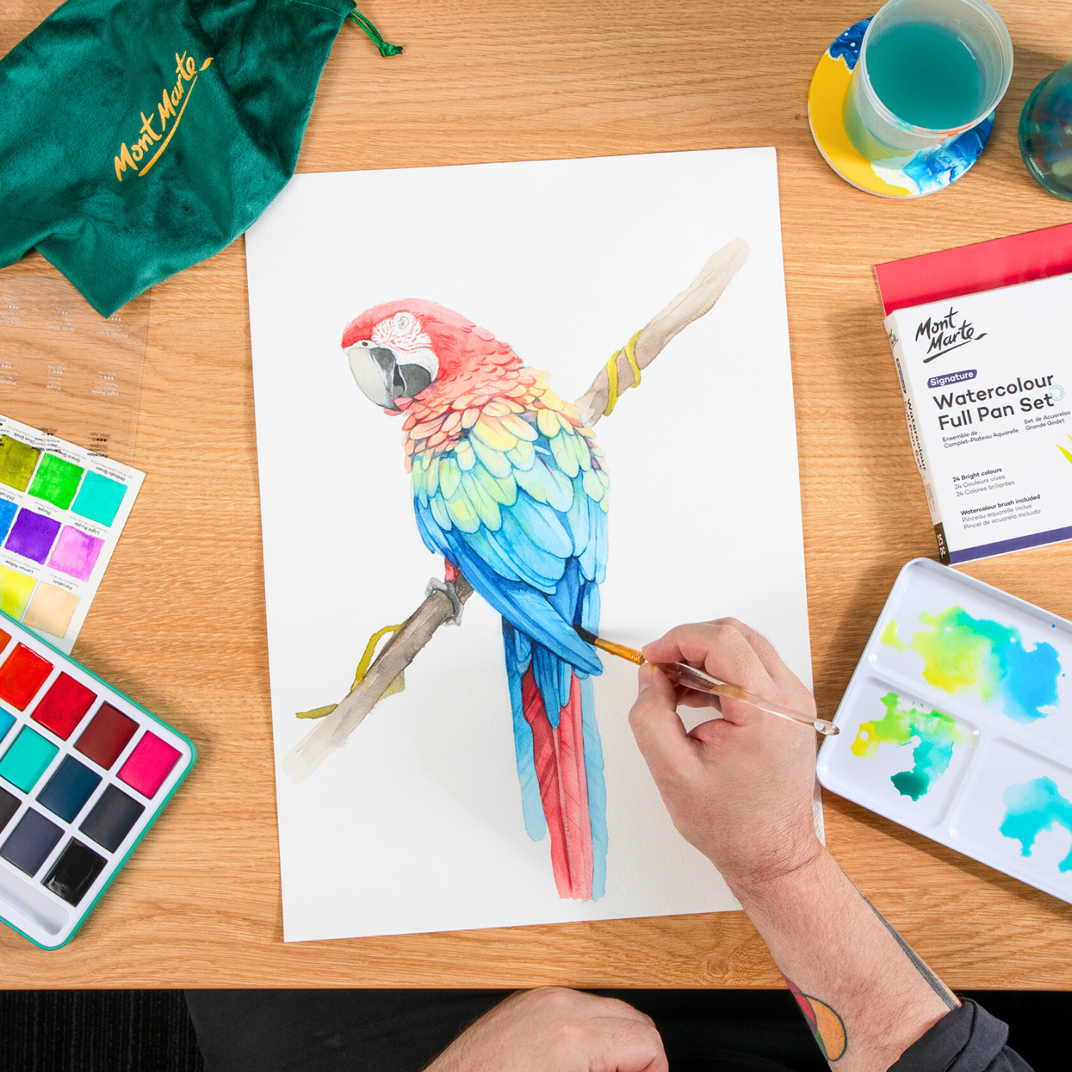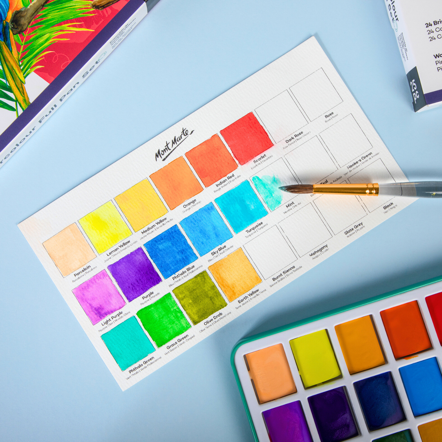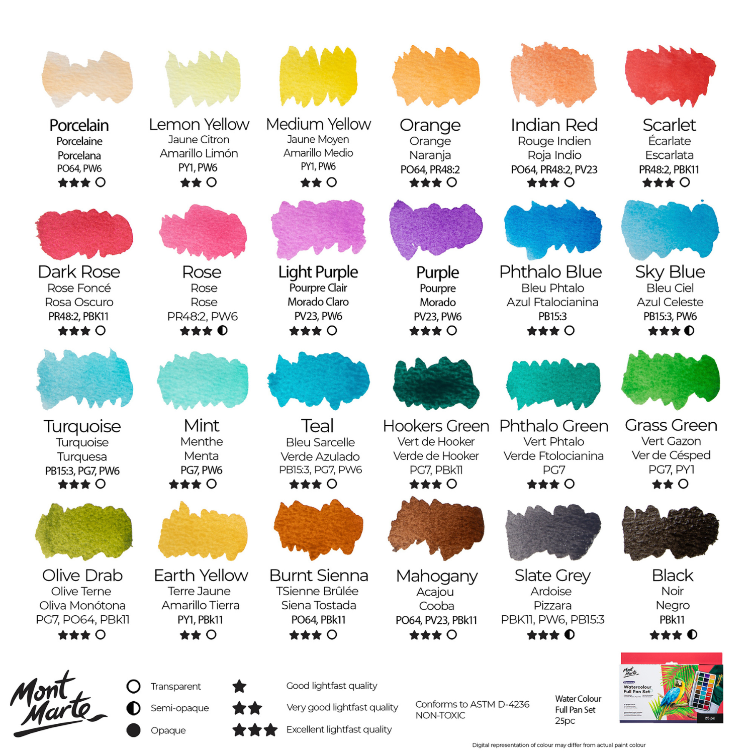 • Watercolour set includes: 24 Vibrant colours: Porcelain, Lemon Yellow, Medium Yellow, Orange, Indian Red, Scarlet, Dark Rose, Rose, Light Purple, Purple, Phthalo Blue, Sky Blue, Turquoise, Mint, Teal, Hooker's Green, Phthalo Green, Grass Green, Olive Drab, Earth Yellow, Burnt Sienna, Mahogany, Slate Grey, and Black