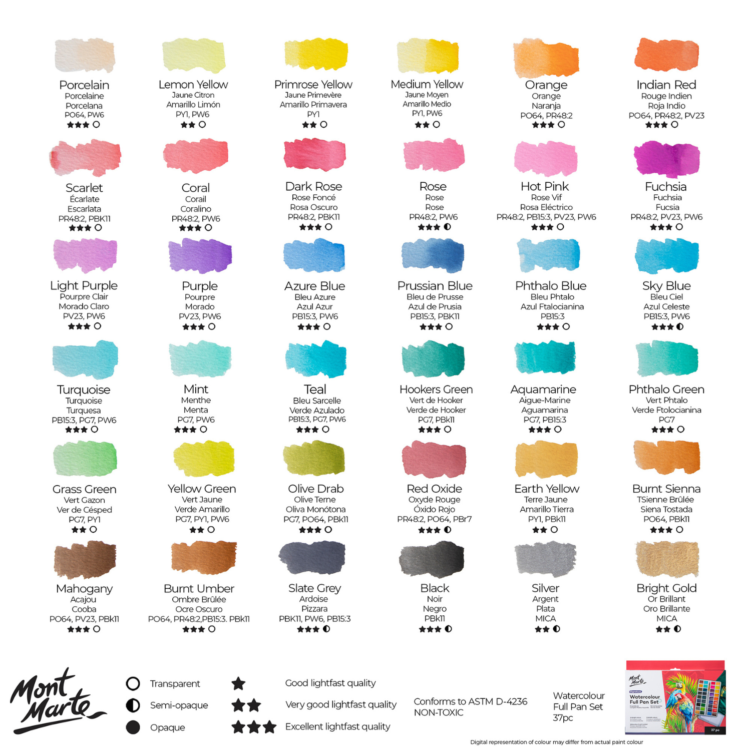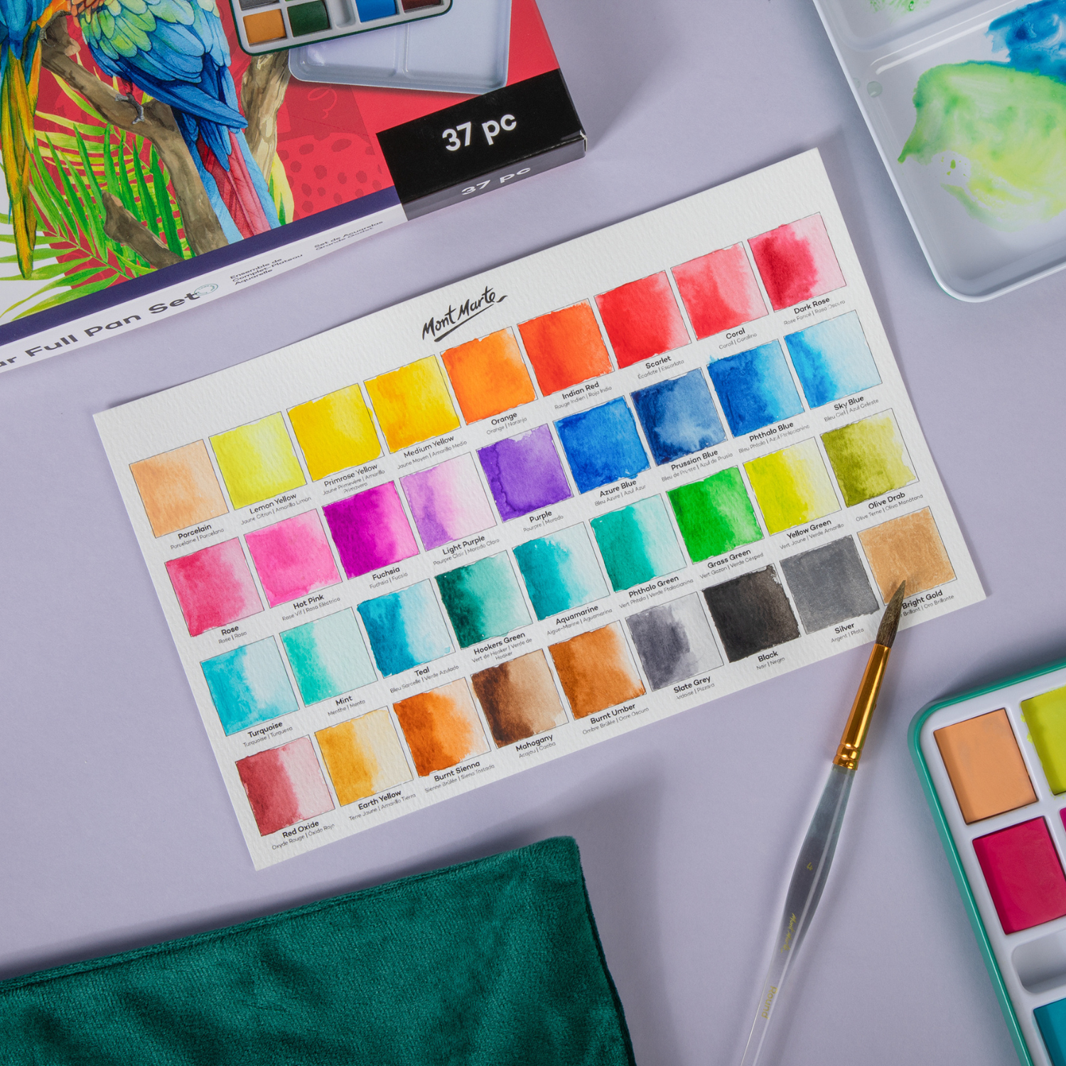 Watercolour set includes: 36 Vibrant colours: Porcelain, Lemon Yellow, Primrose Yellow, Medium Yellow, Orange, Indian Red, Scarlet, Coral, Dark Rose, Rose, Hot Pink, Fuchsia, Light Purple, Purple, Azure Blue, Prussian Blue, Phthalo Blue, Sky Blue, Turquoise, Mint, Teal, Hooker's Green, Aquamarine, Phthalo Green, Grass Green, Yellow Green, Olive Drab, Red Oxide, Earth Yellow, Burnt Sienna, Mahogany, Burnt Umber, Slate Grey, Black, Silver and Gold