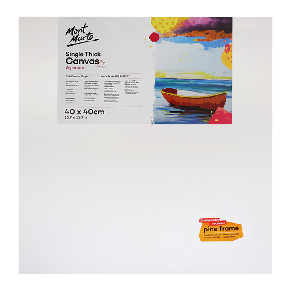Mont Marte Signature Single Thick Canvases are the perfect painting surface for beginner artists. Triple coated with acrylic titanium primer and ready to be painted on. Made using environmentally friendly cotton duck canvas and back stapled for a neat, artist quality edge.
