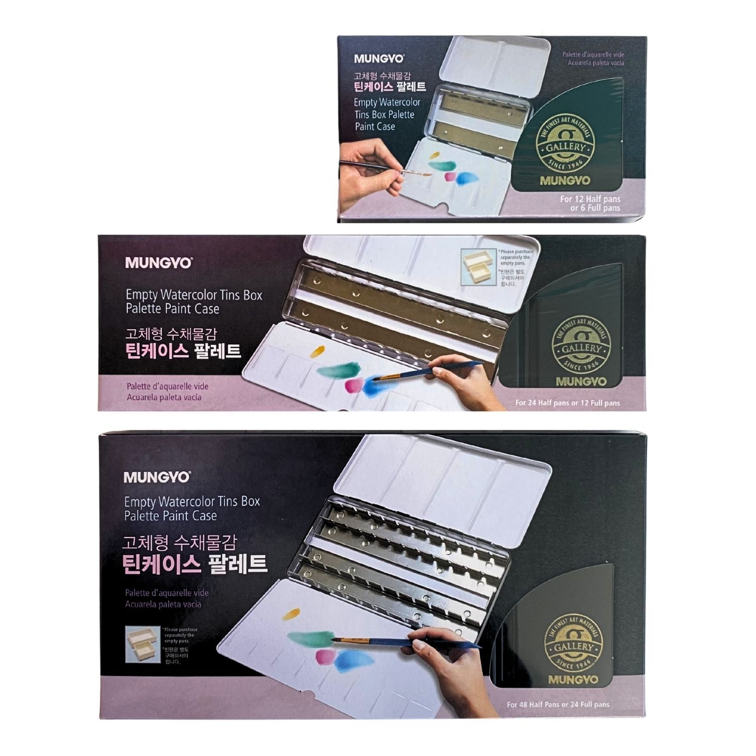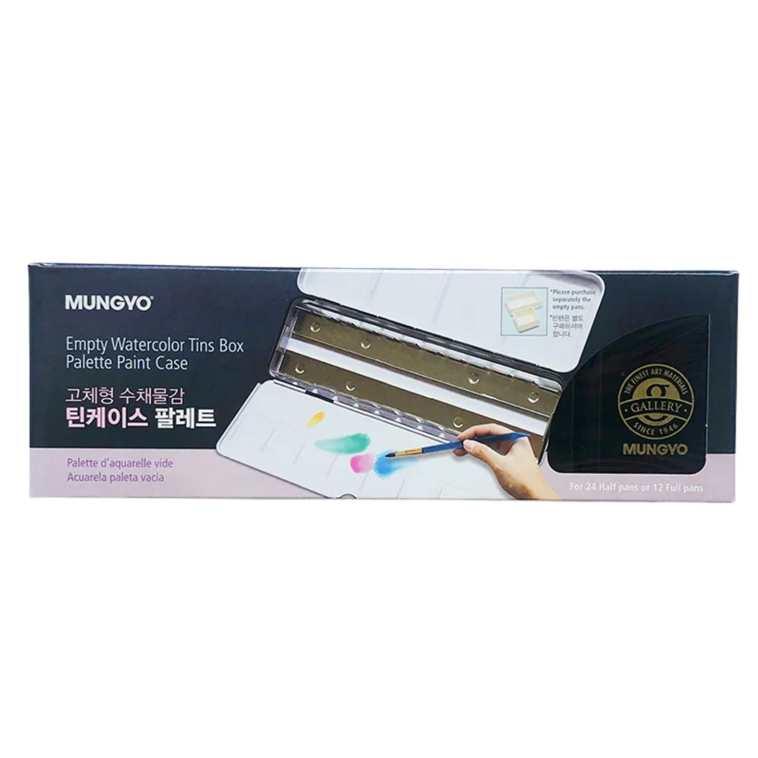 The Mungyo Empty Watercolour Tin Case Palette – Medium is an option that holds 24 pans for artists who prefer to build their own customised watercolour set. The metal tin case provides ample room to organise a wider range of colours for studio work or to take to classes.