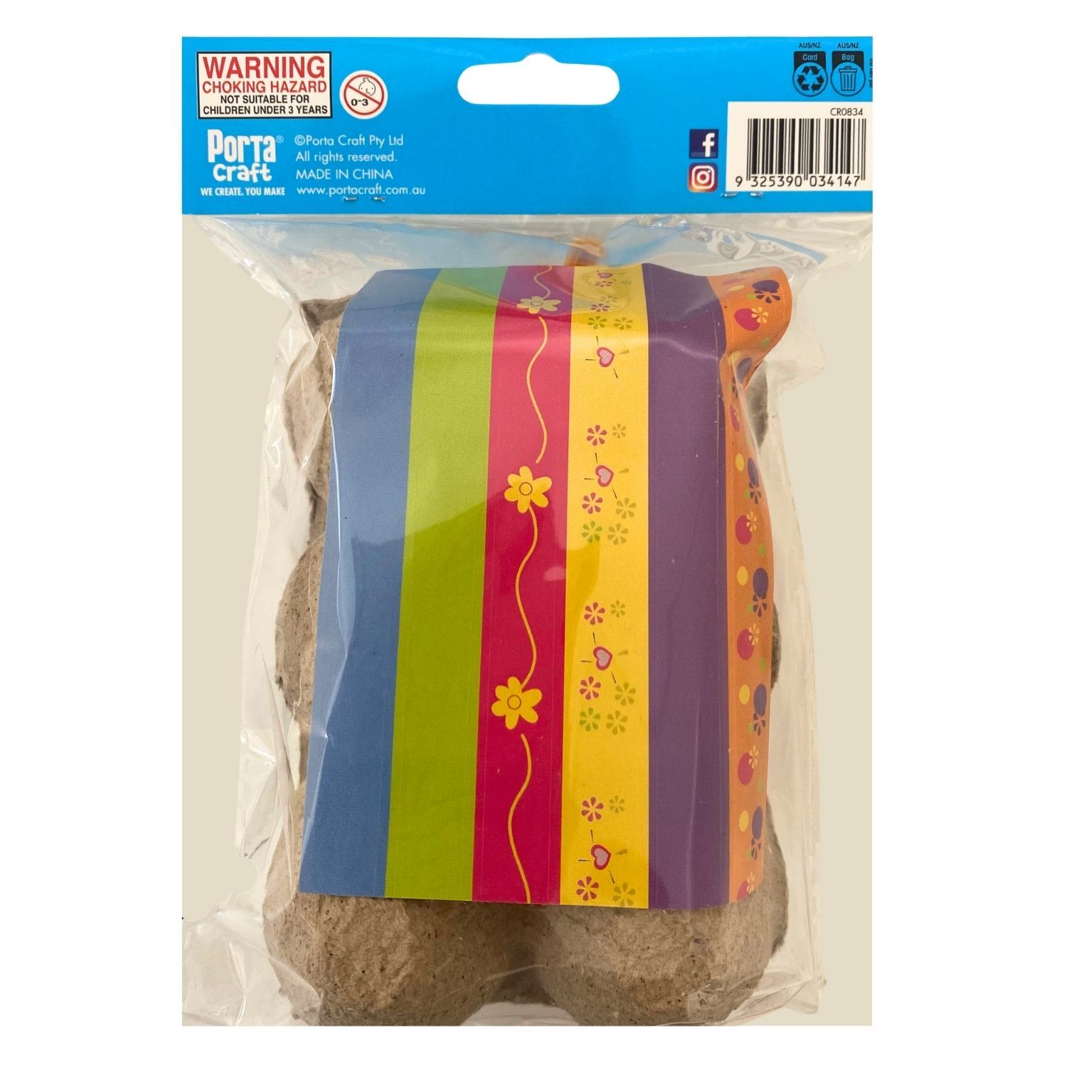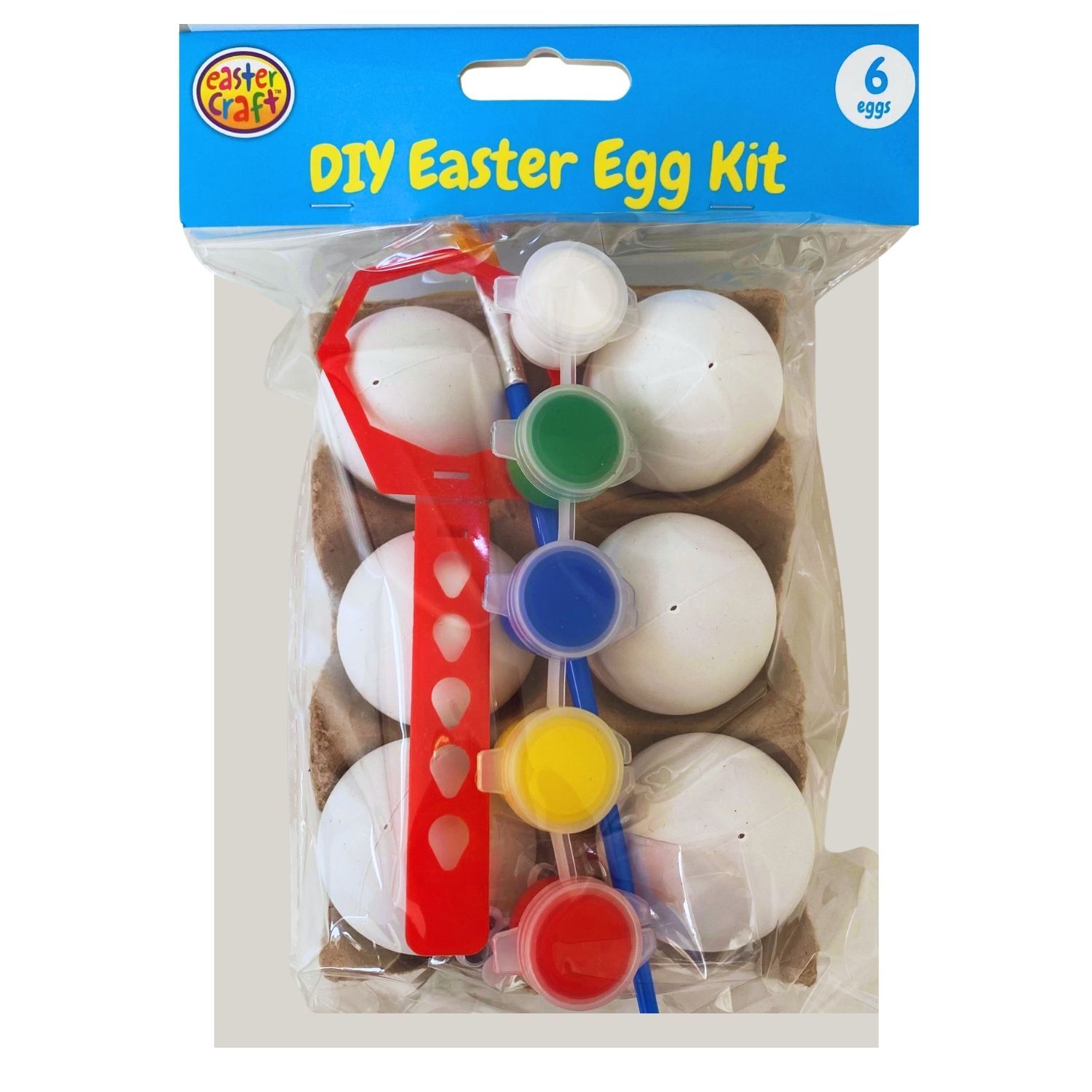 The pack includes 6 eggs, 5 paint pots, a paint brush, googley eyes, an egg holder, and a colour card to create pretty patterns.