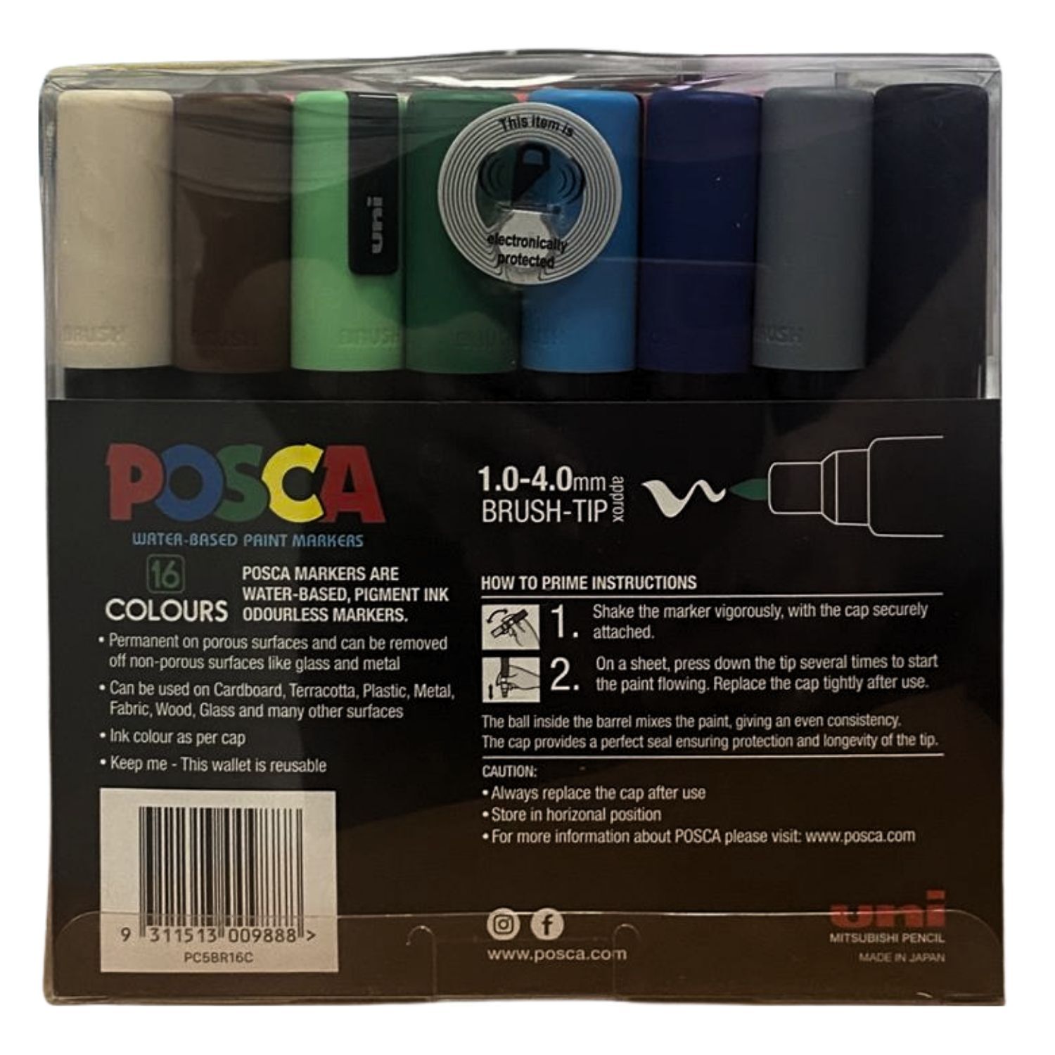 16 x Posca PC-5BR brush tip paint markers: White, Beige, Yellow, Orange, Red, Coral Pink, Pink, Light Pink, Violet, Green, Light Green, Blue, Light Blue, Brown, Grey and Black.