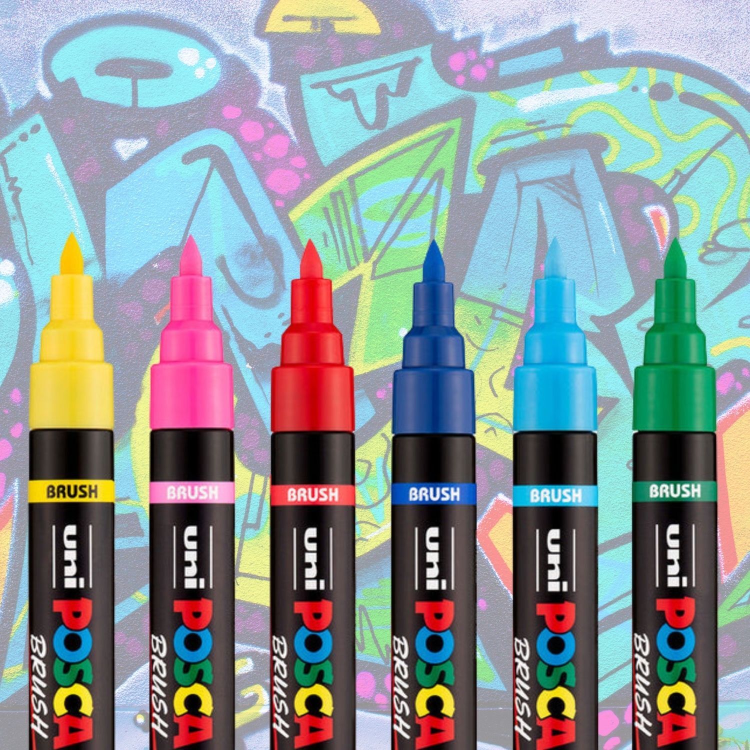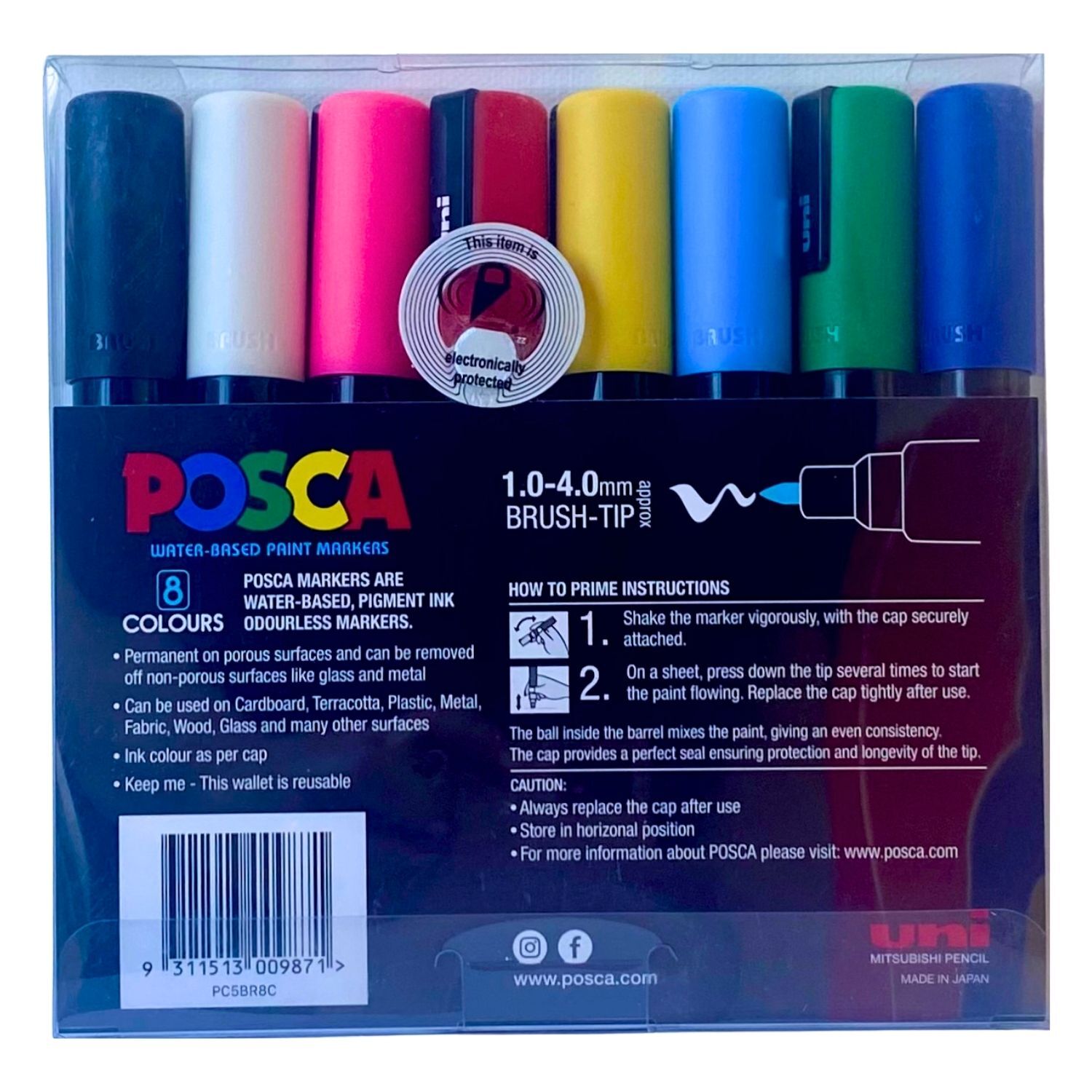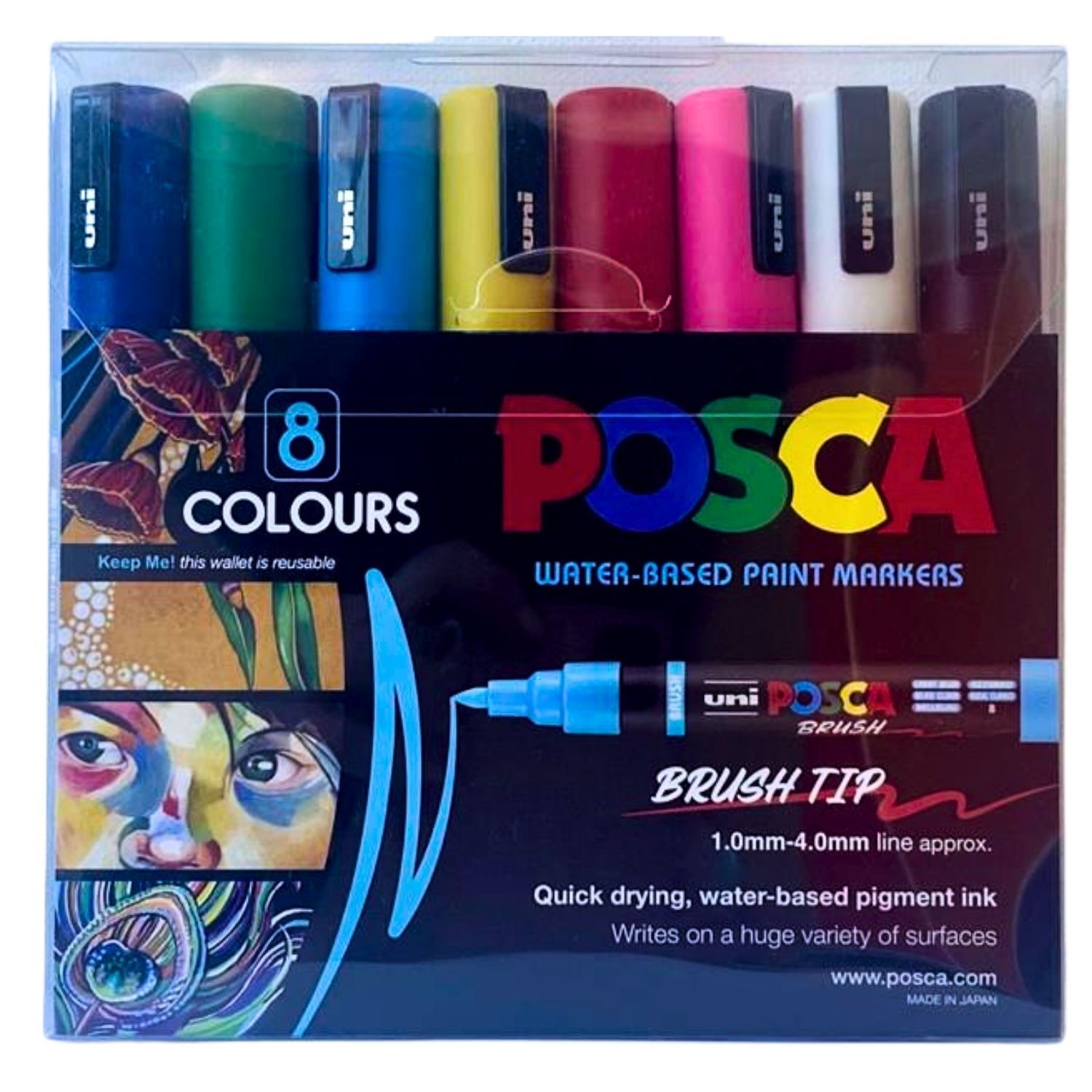 8 x Posca PC-5BR brush tip paint markers: White, Yellow, Pink, Red, Blue, Light Blue, Green and Black.