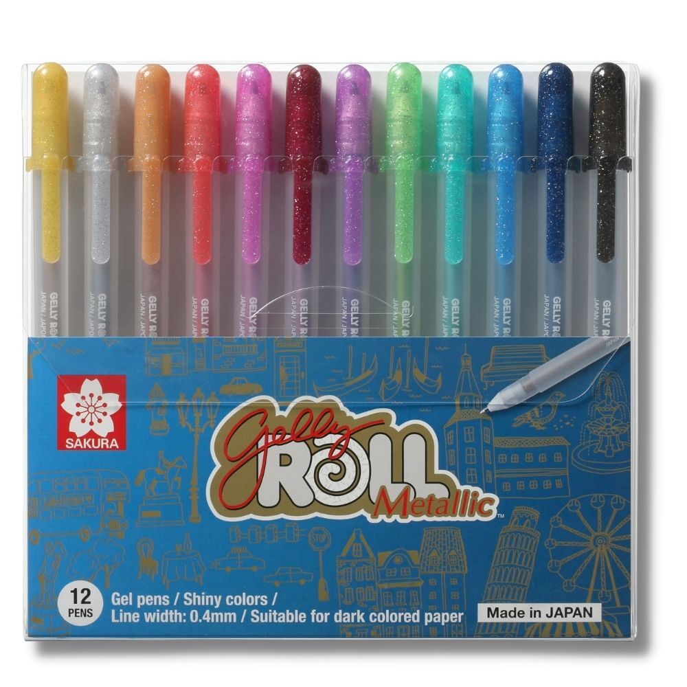 12 x Gelly Pens in shiny colours: Gold, Silver, Copper, Metallic Red, Metallic Pink, Metallic Burgundy, Metallic Purple, Metallic Emerald, Metallic Green, Metallic Blue, Metallic Blue Black, and Metallic Black.