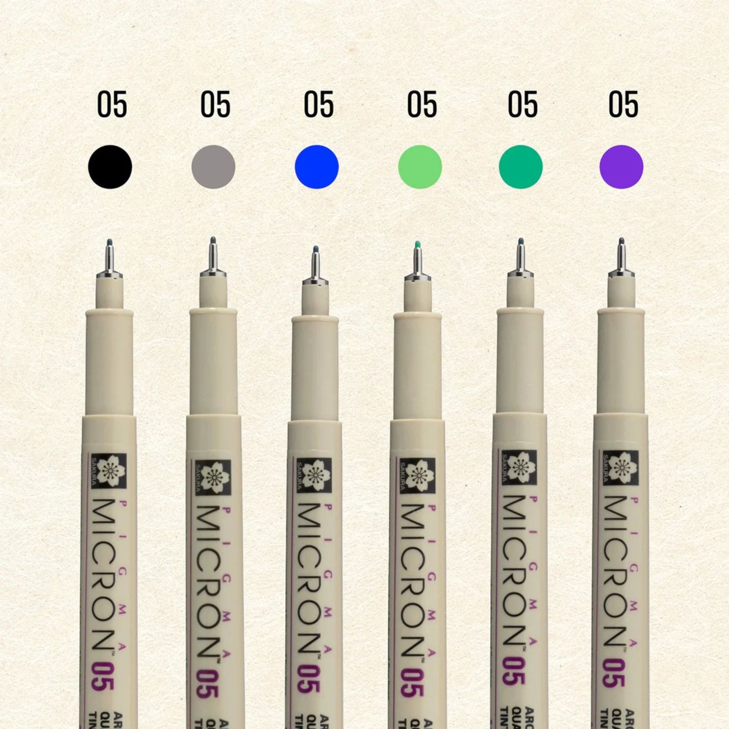 Set of 6 Fineliners includes: Black, Grey, Blue, Light Green, Dark Green, and Purple