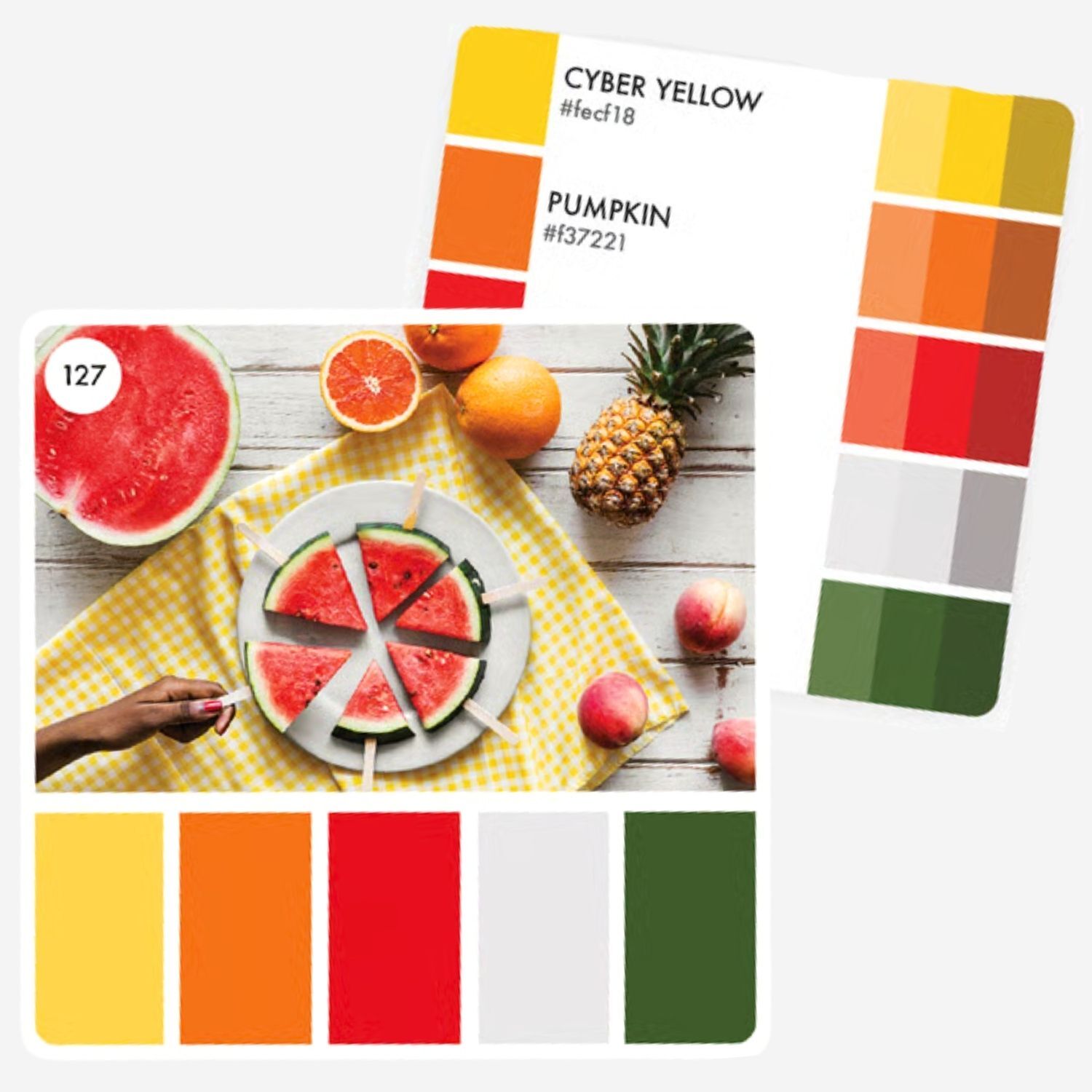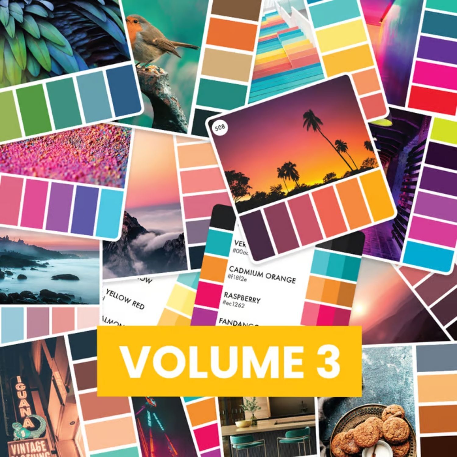 Volume 3 introduces more refined and contemporary palettes, with nuanced colour relationships, muted tones and sophisticated combinations. Themes include breathtaking sunsets, coastal views, floeral arrangements, interior design, majestic mountains, neon glow, sugar rush, retro flair, rainbows, fancy foods, and beautiful birds.