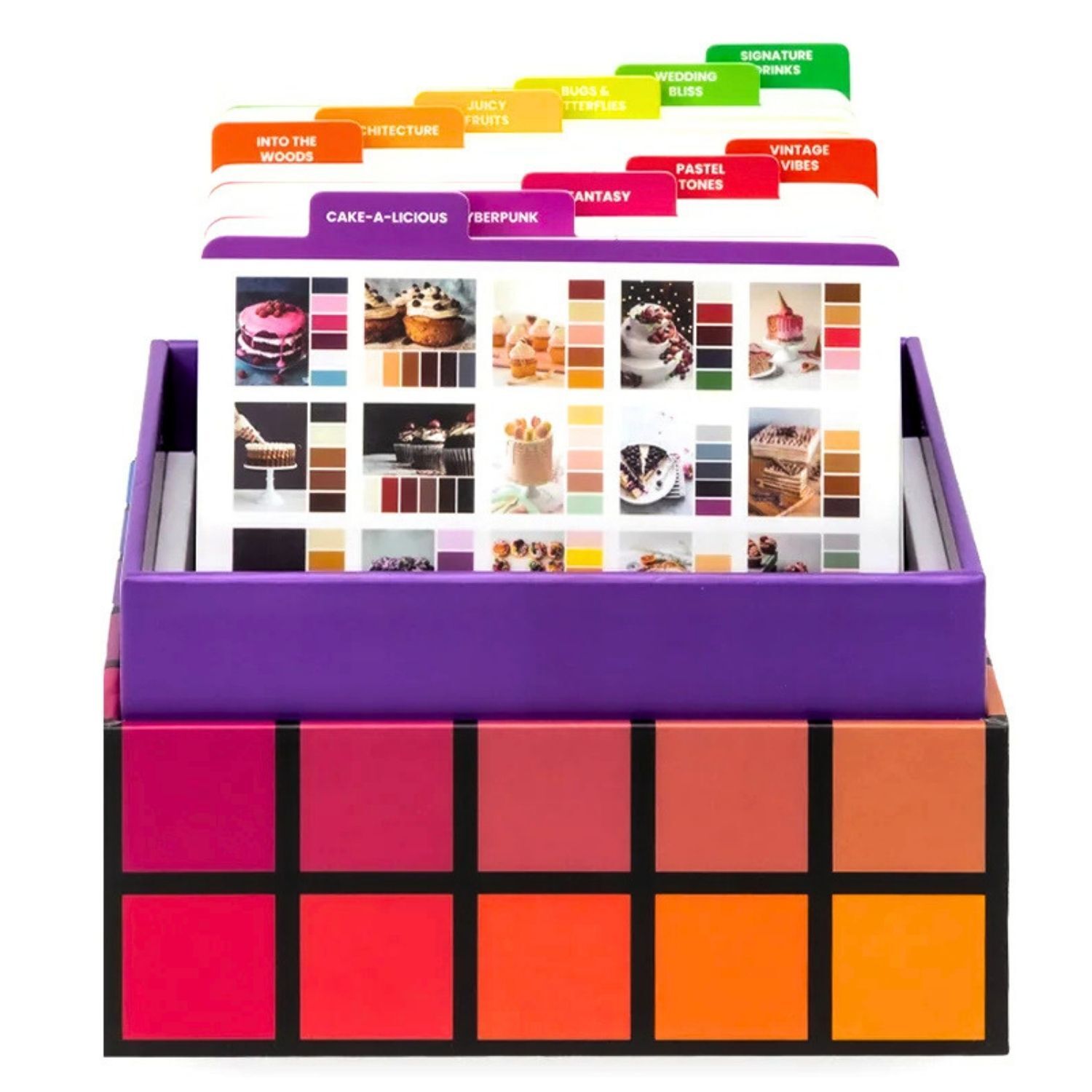 Volume 4 explores bold and adventurous palettes, featuring stronger contrasts and more dynamic colour combinations for expressive work. Themes include cake-a-licious, cyberpunk, fantasy, pastel tones, vintage vibes, into the woods, architecture, juicy fruits, bugs & butterflies, wedding bliss, and signature drinks.