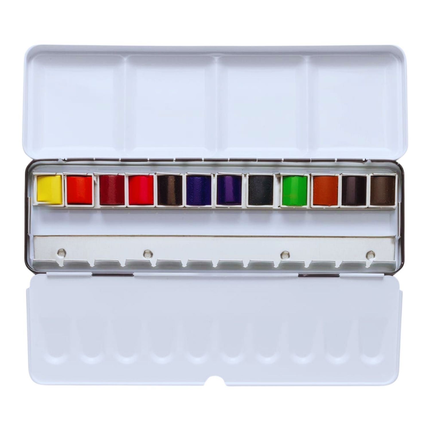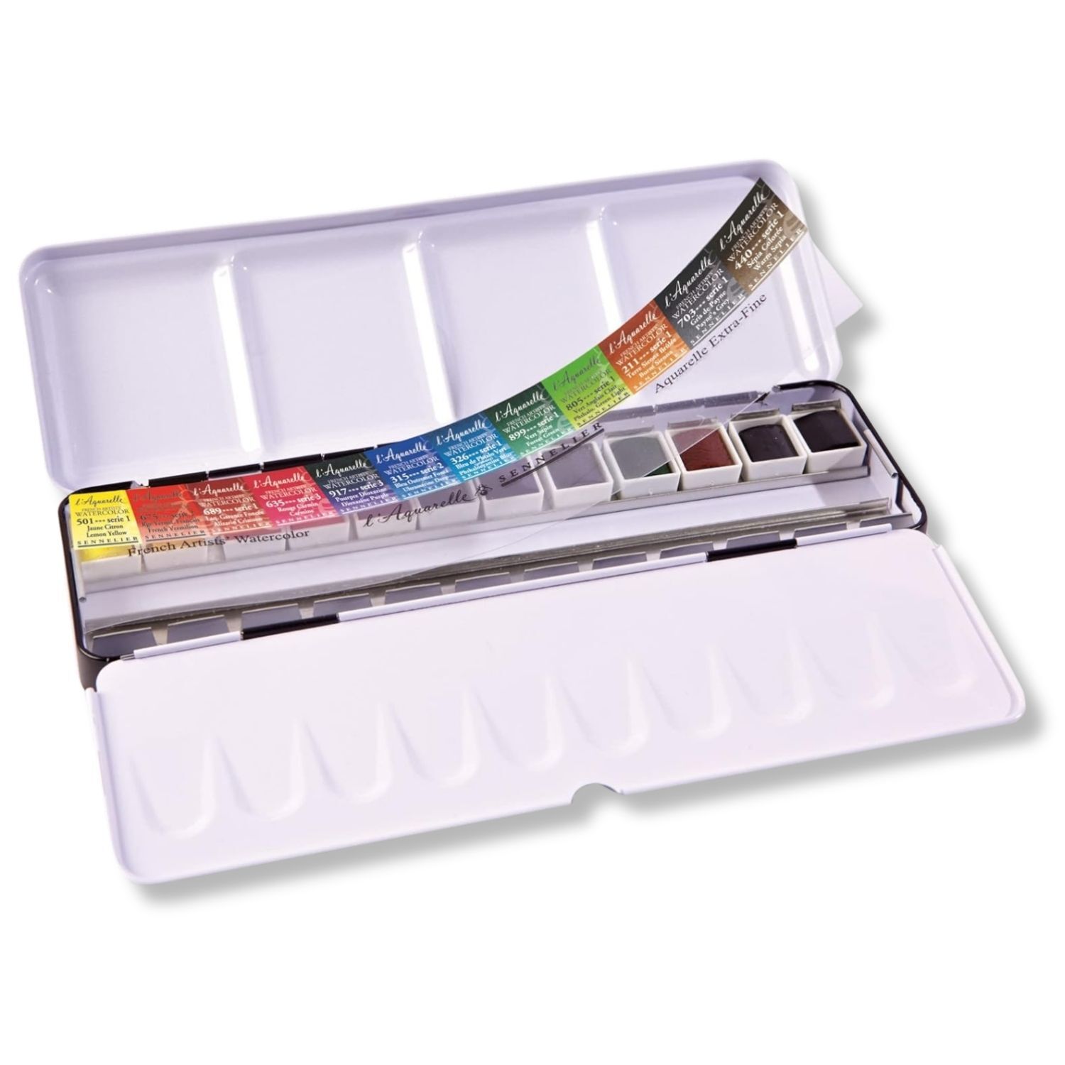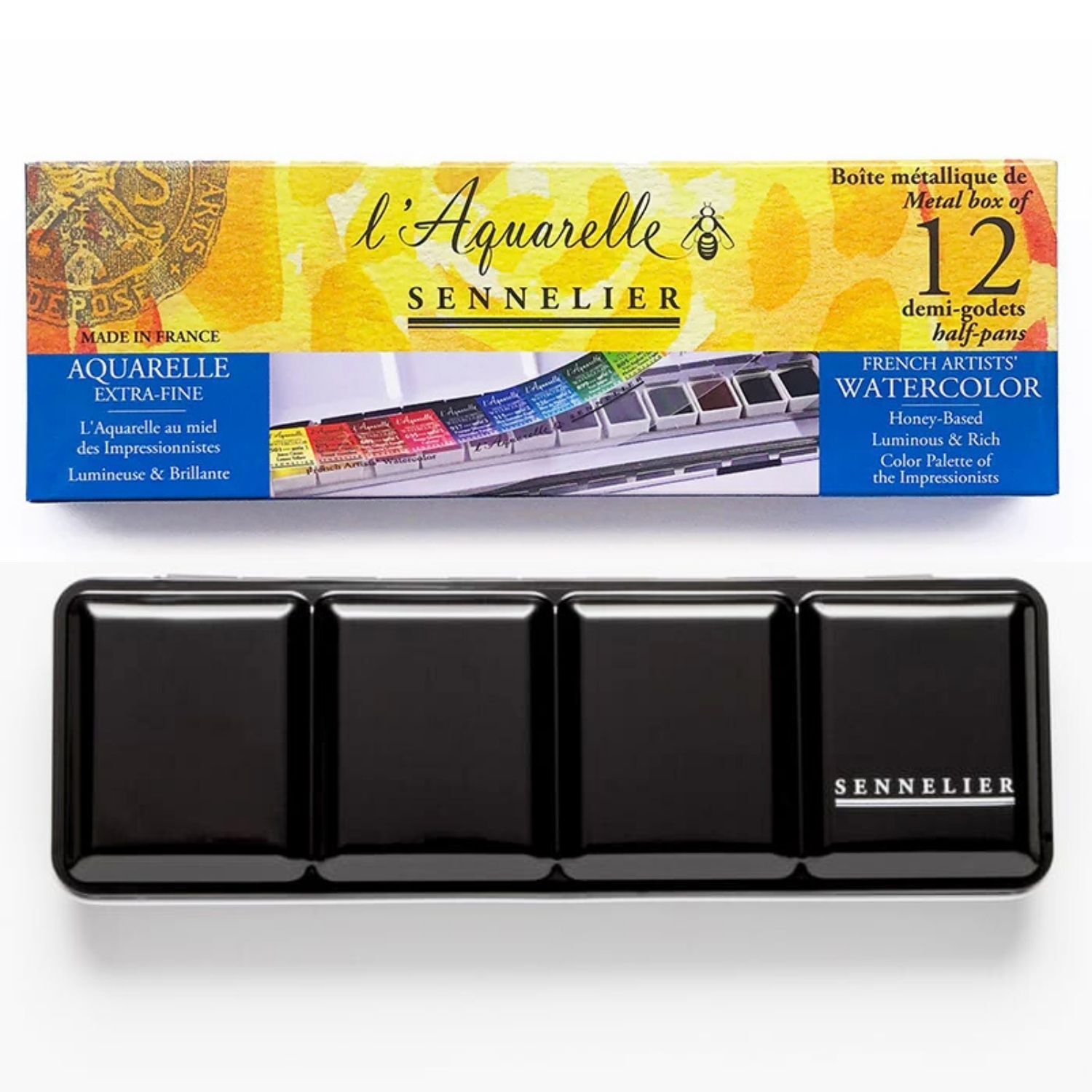 The metal box comes pre-filled with 12 carefully selected Sennelier half pans and 12 empty compartments, allowing artists to expand their palette with additional watercolours, custom mixes, or personal favourites. The compact, durable design makes it ideal for studio use or painting on the go.