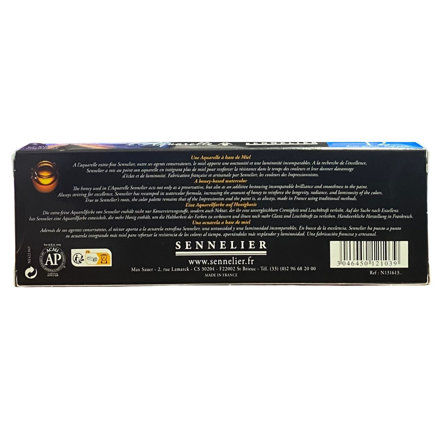 The Gum Arabic and honey combination offers incomparable quality of application, producing superb washes. Then, this base is mixed with pigments and carefully ground. Sennelier makes sure to wet the pigments in purified water (with no mineral salts) for 24 hours before mixing them in with the bonding agent. This improves the way in which the colours and bonding merge together, in turn bringing out the full beauty of the colours.