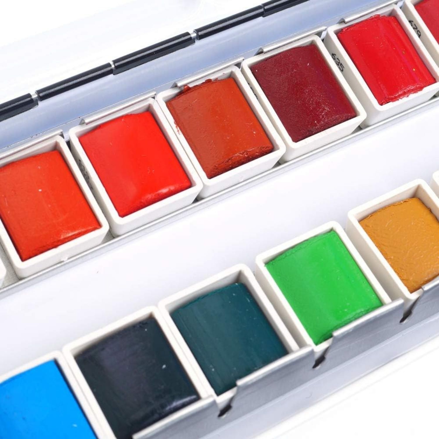 Watercolour Half Pan Set of 24 colours - Lemon Yellow (501), Indian Yellow (517), Naples Yellow Deep (566), French Vermillion (675), Bright Red (619), Venetian Red (623), Alizarin Crimson (689), Carmine (635), Quinacridone Red (679), Opera Rose (659), Cobalt Violet light Hue (911), Dioxazine Purple (917), Ultramarine Deep (315), Phthalo Blue (326), Cinerous Blue (344), Forest Green (899), Viridian Green (837), Phthalo Green Light (805), Burnt Sienna (211), Yellow Ochre (252), Payne's Grey (703), Warm Sepia (440), Raw Umber (205), and Ivory Black (755).