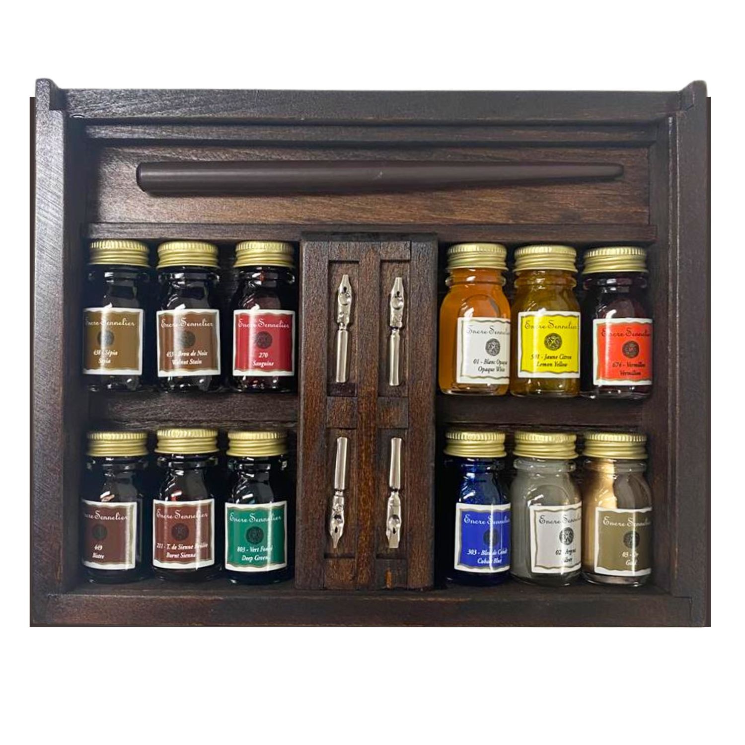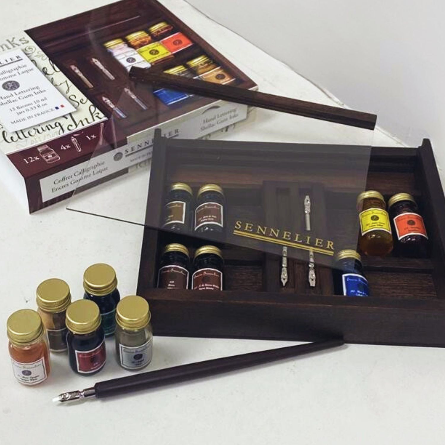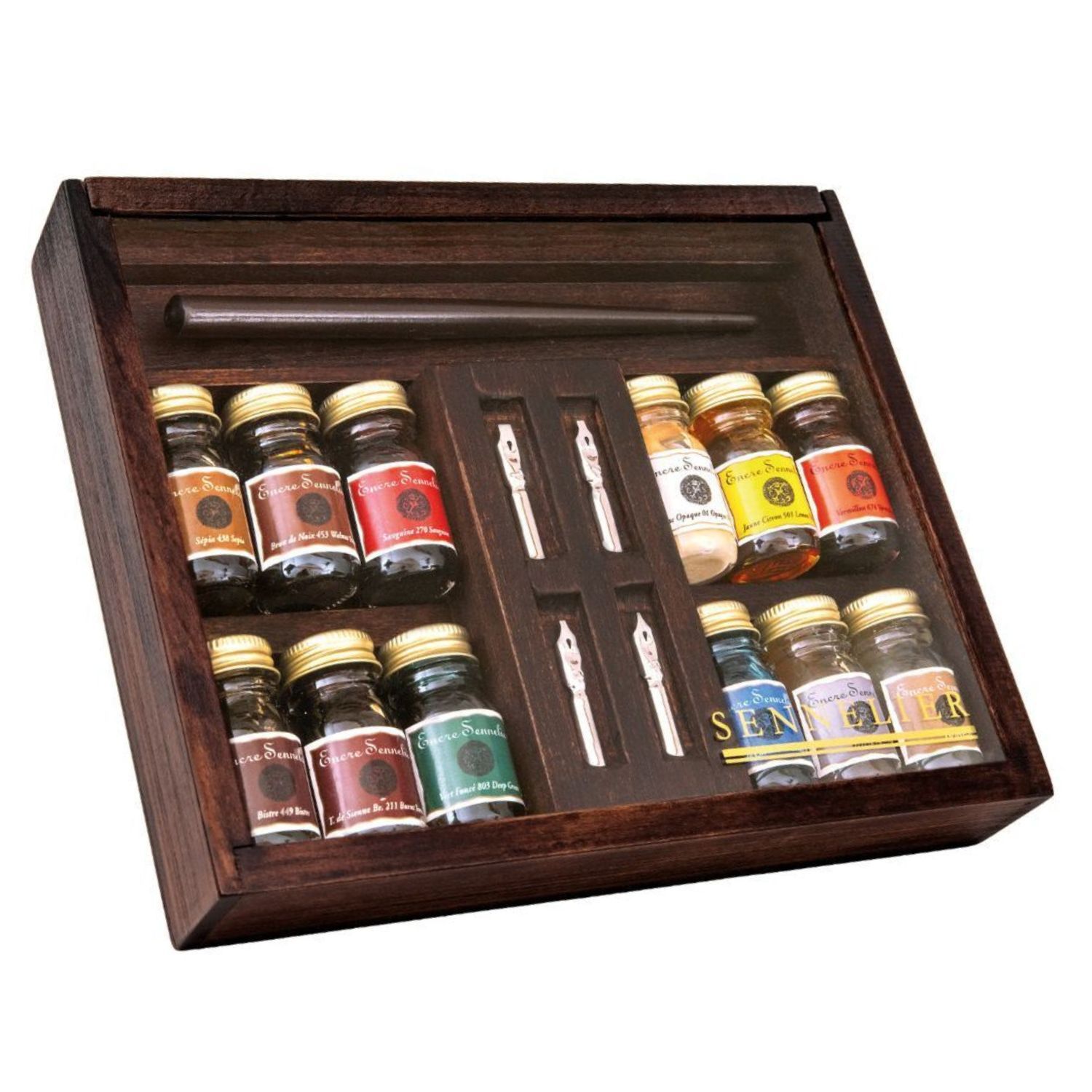 Sennelier Encre Ink Wooden Box Set - 12 x 10ml Bottles + Pen with Nibs - Hand Lettering Inks