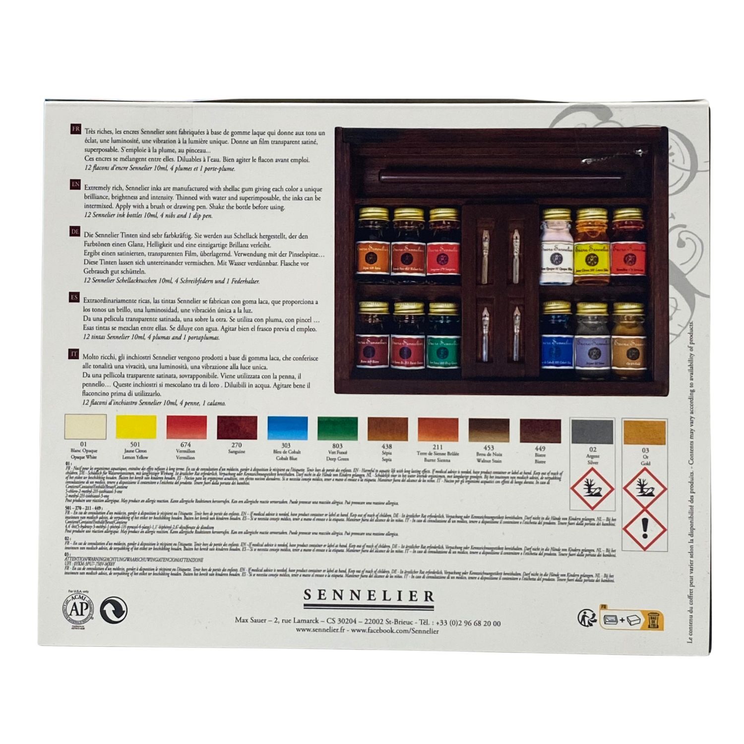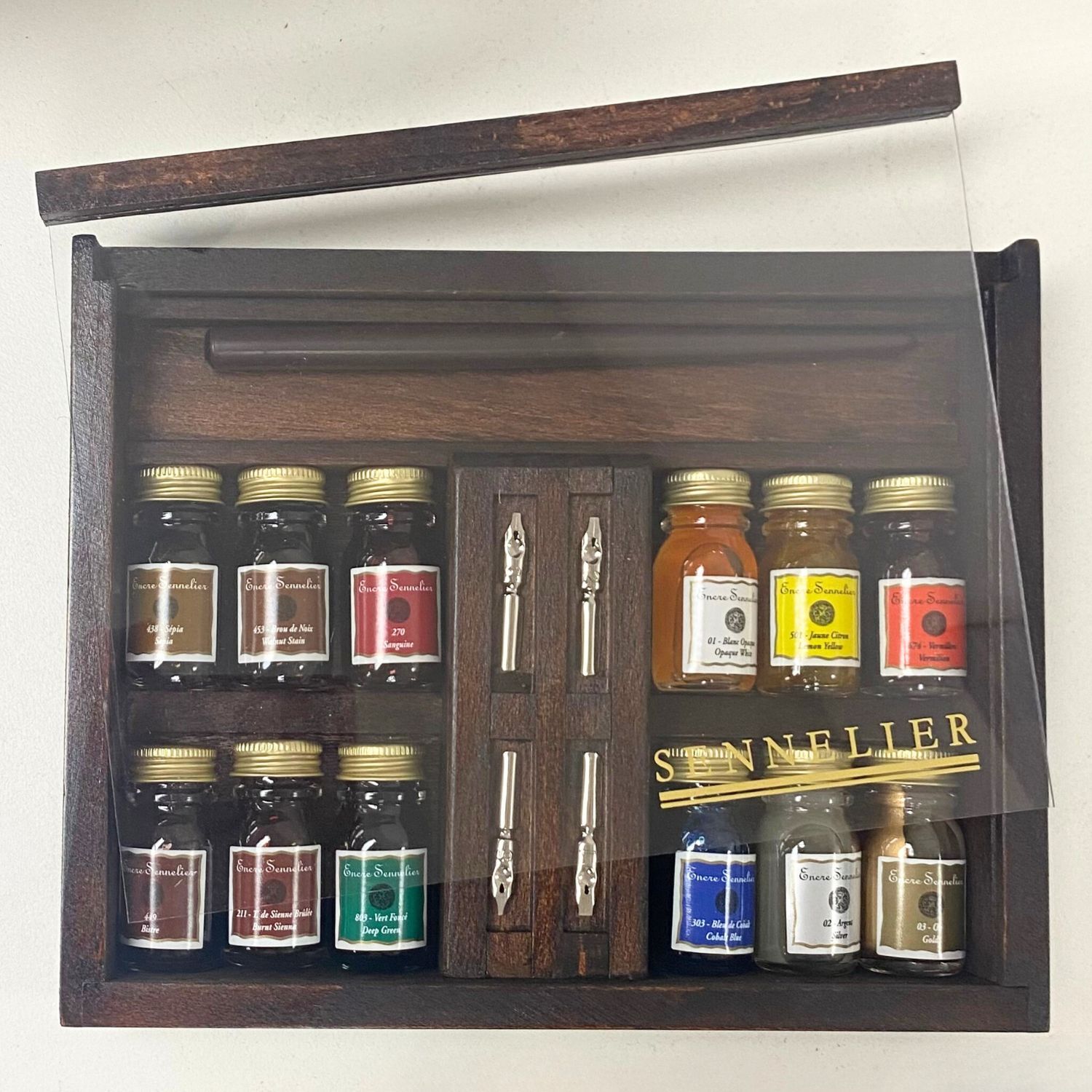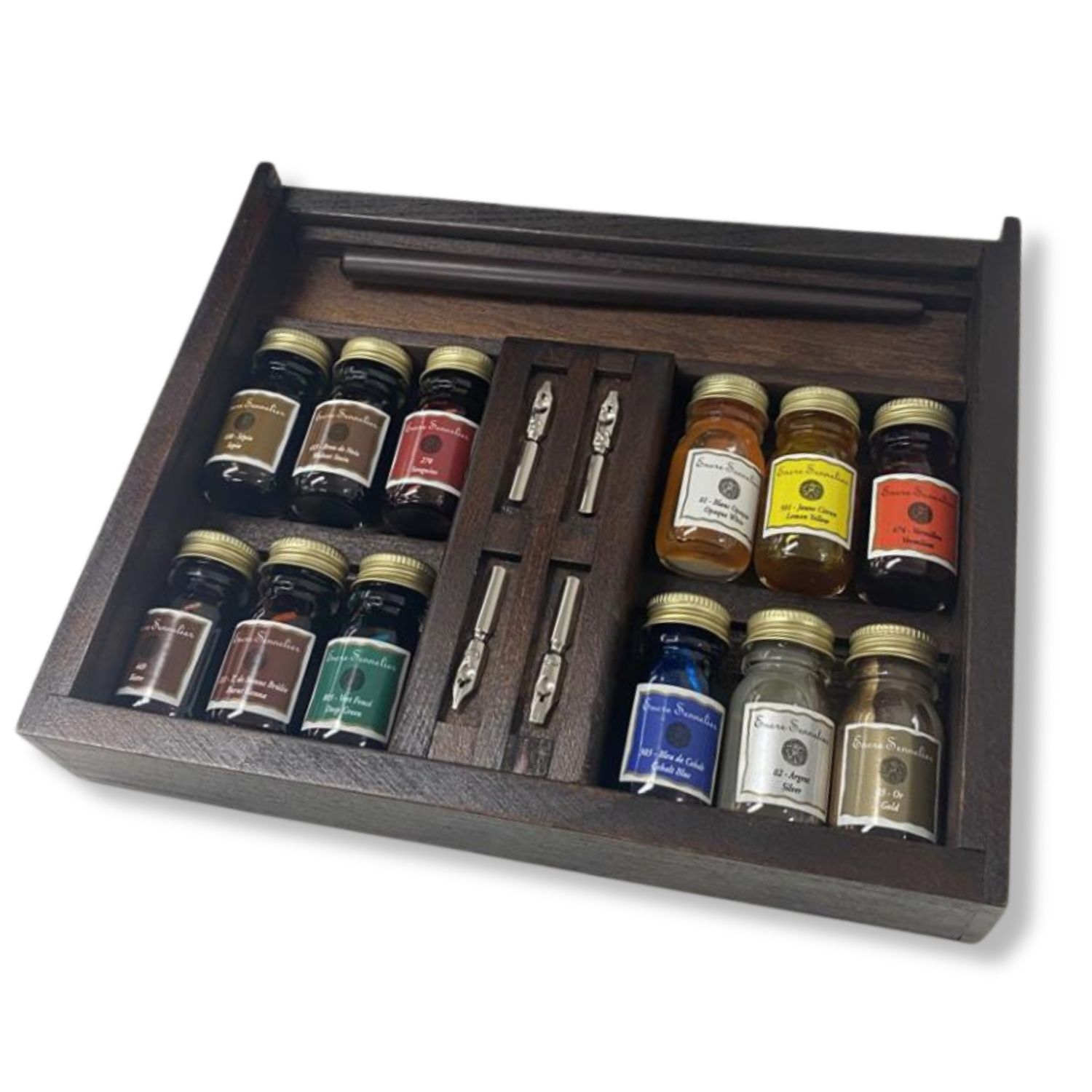 Sennelier Encre Ink Wooden Box Set - 12 x 10ml Bottles + Pen with Nibs - Hand Lettering Inks