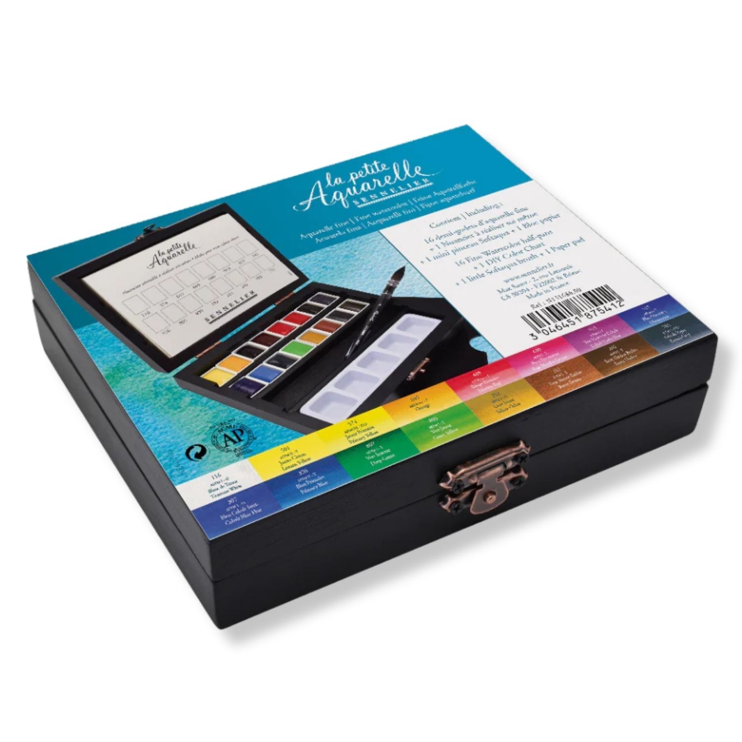 La Petite Aquarelle Black Box – 16 Half Pans, Brush Pen & Palette in Wooden Box