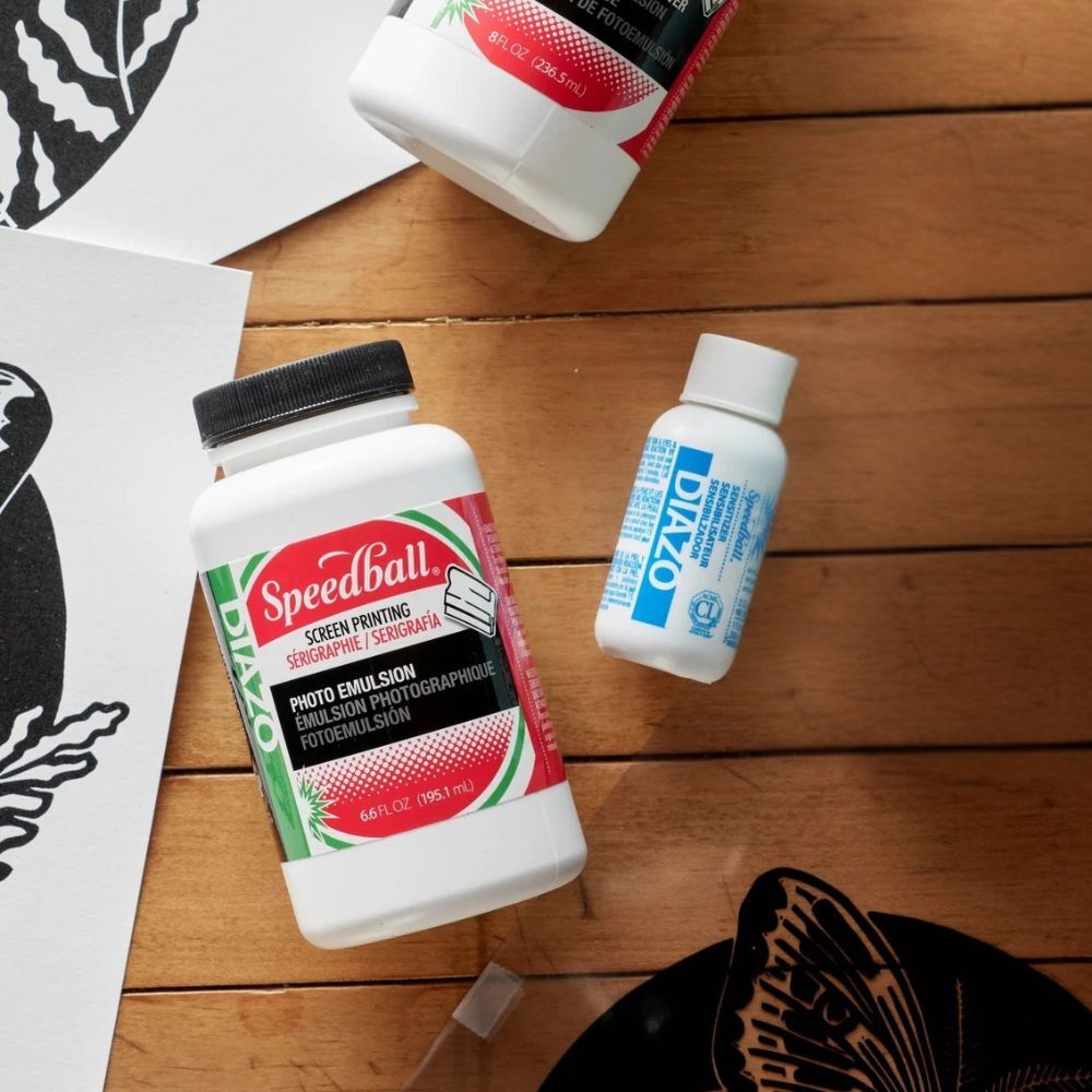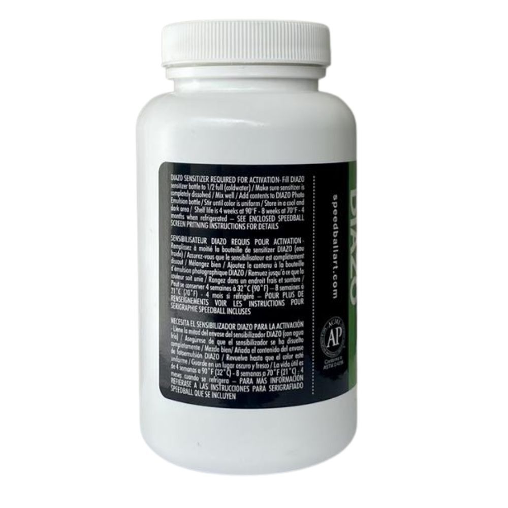 Must add contents of entire bottle to diazo photo emulsion (#4579) 3-year shelf life unmixed. Sensitiser is a light-sensitive chemical paste added to Speedball Photo Emulsion to make it ready for screen printing. The small bottle, which appears almost empty, contains a concentrated paste that must be mixed with water—roughly 3/4 full—and then thoroughly stirred into the emulsion, changing its color from light blue to a light-sensitive green