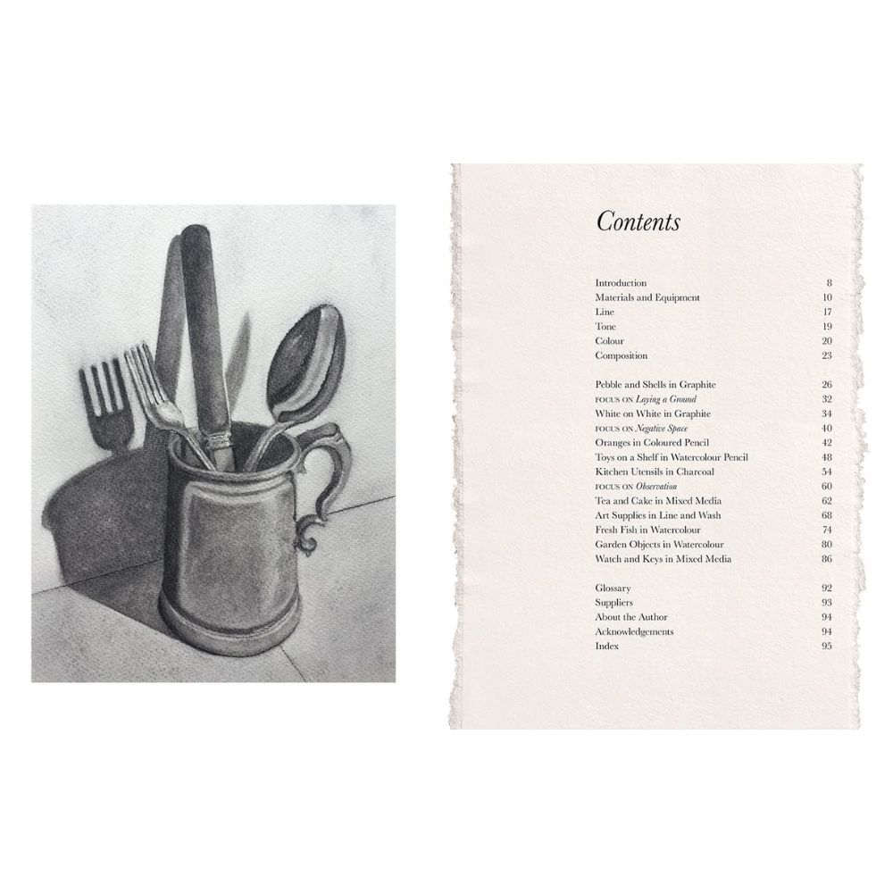 There are ten tutorials showing how to draw and paint a variety of still life subjects using beginner-friendly materials, including pencil, charcoal, coloured pencils, pen and ink, watercolour paints and watercolour pencils. Each tutorial has a list of the materials and tools required, step-by-step photographs of the work, informative text and tips and strategies for getting the best results.
