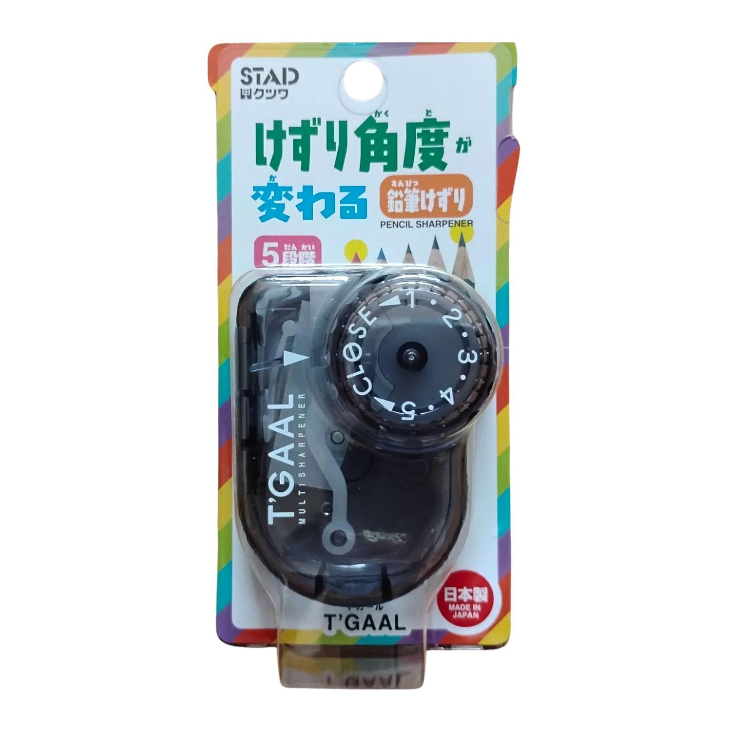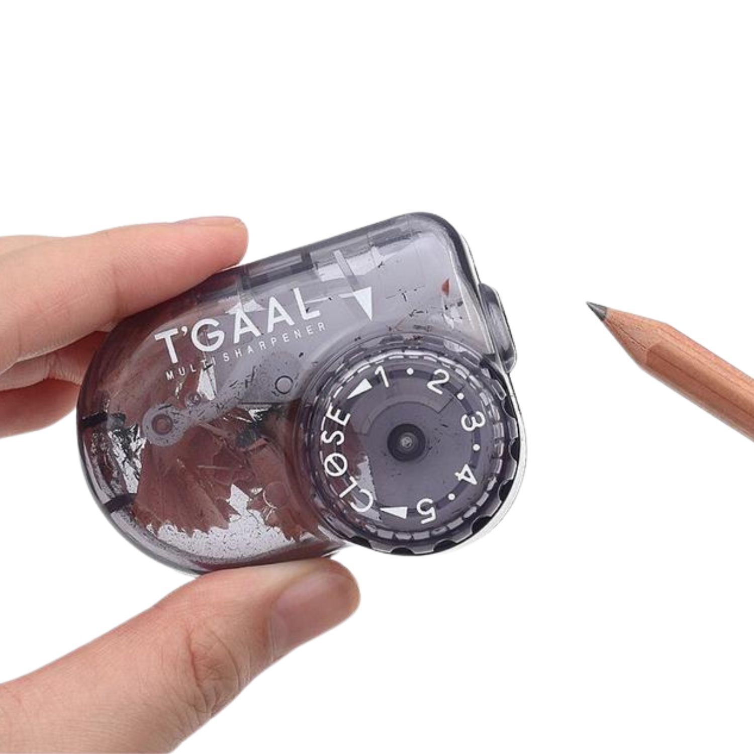 The Stad T'Gaal Pencil Sharpener features a unique dial mechanism to choose between five sharpening angles from 1 (shortest) to 5 (longest). It also has a "Close" setting that shuts the pencil opening to keep shavings from falling out.
