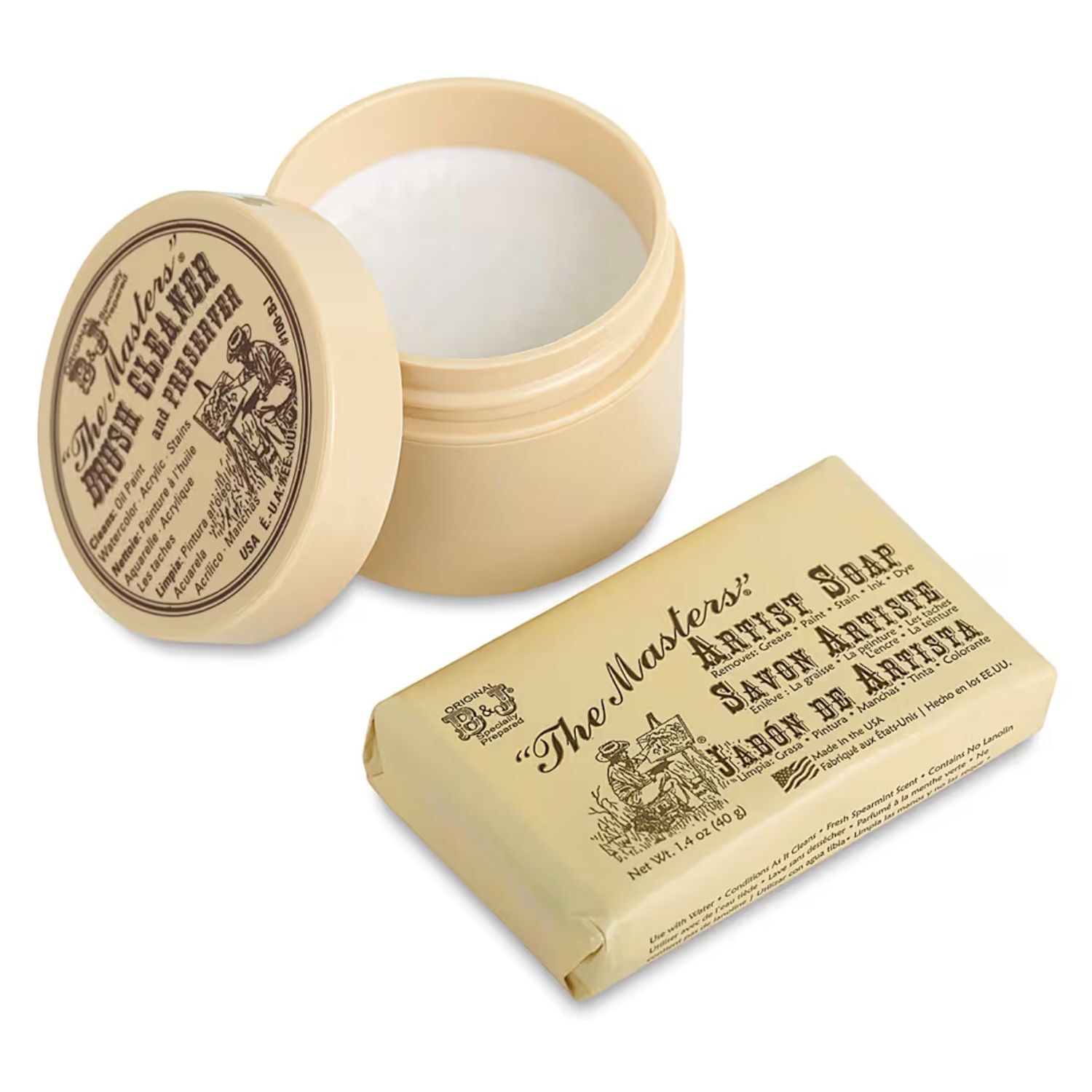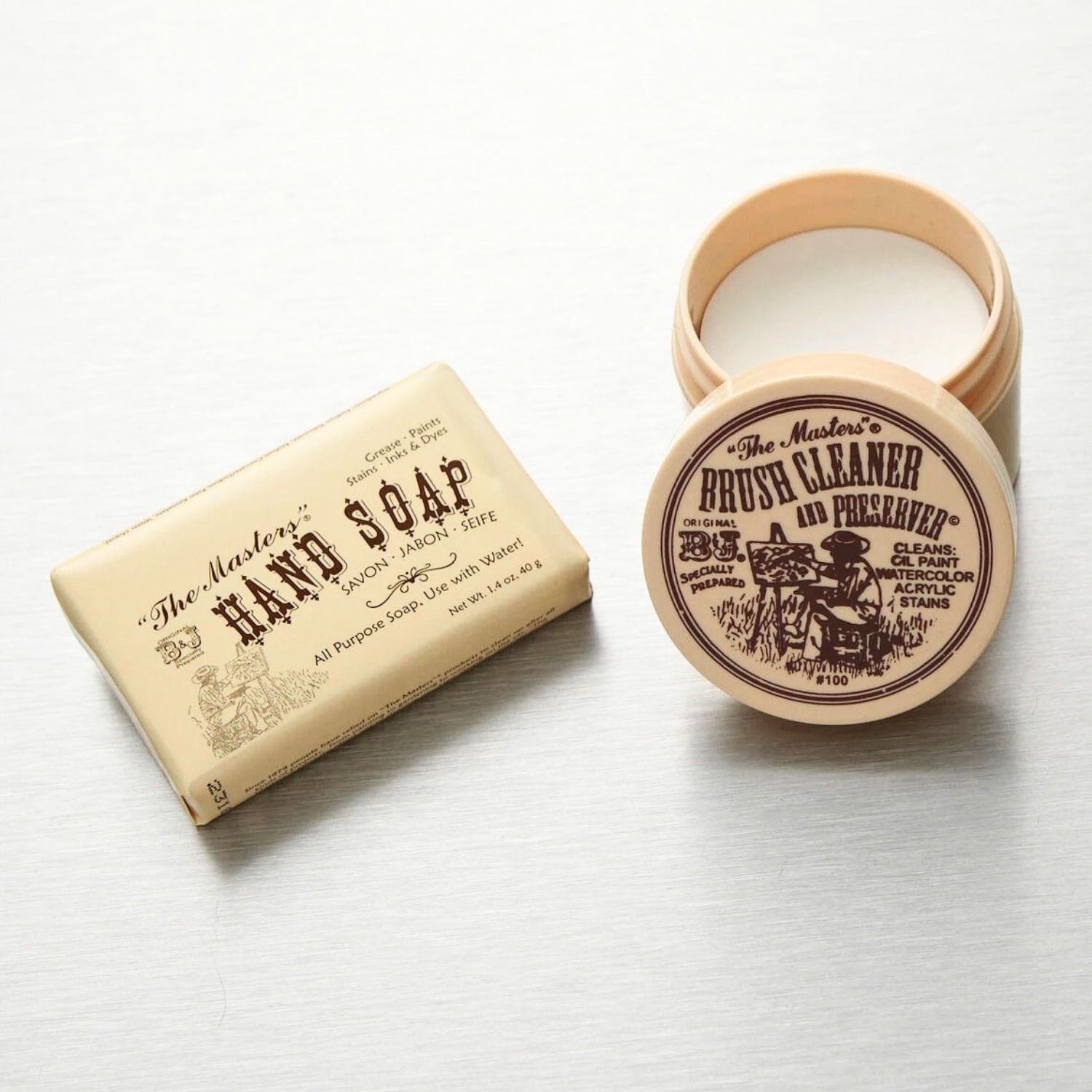 Each package contains a 43g bar of non-toxic hand soap and a 29g jar of brush cleaner and preserver.