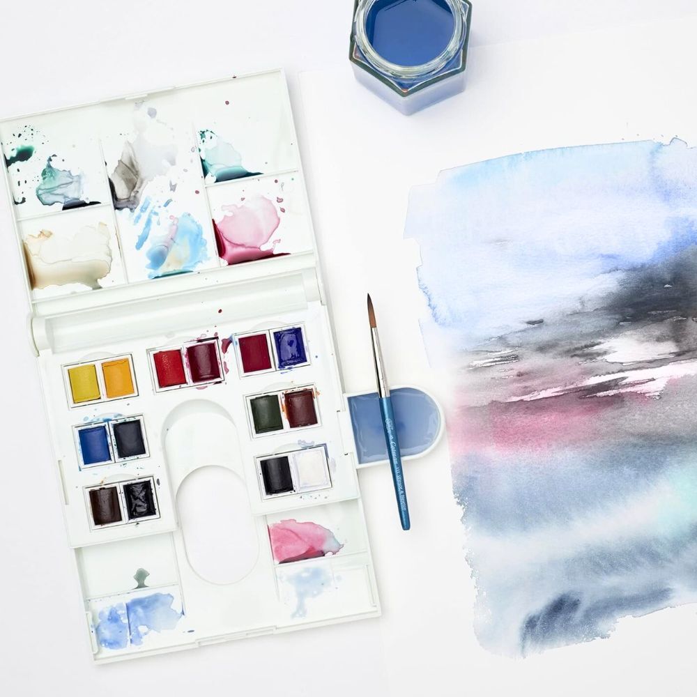 This ultra-compact set flips open and features a waterpan that clips to the side, and a size 5 Winsor & Newton Cotman mini watercolour brush.