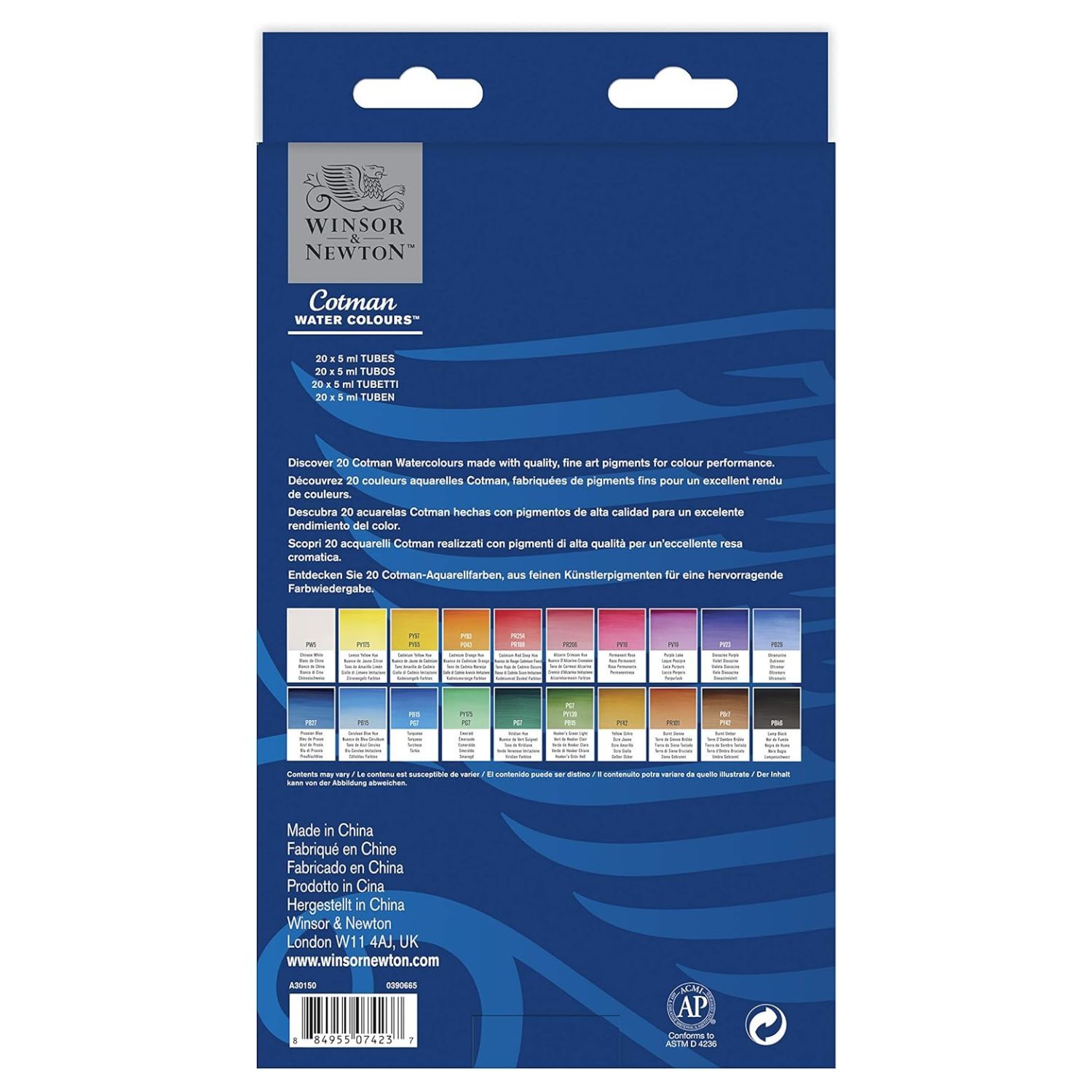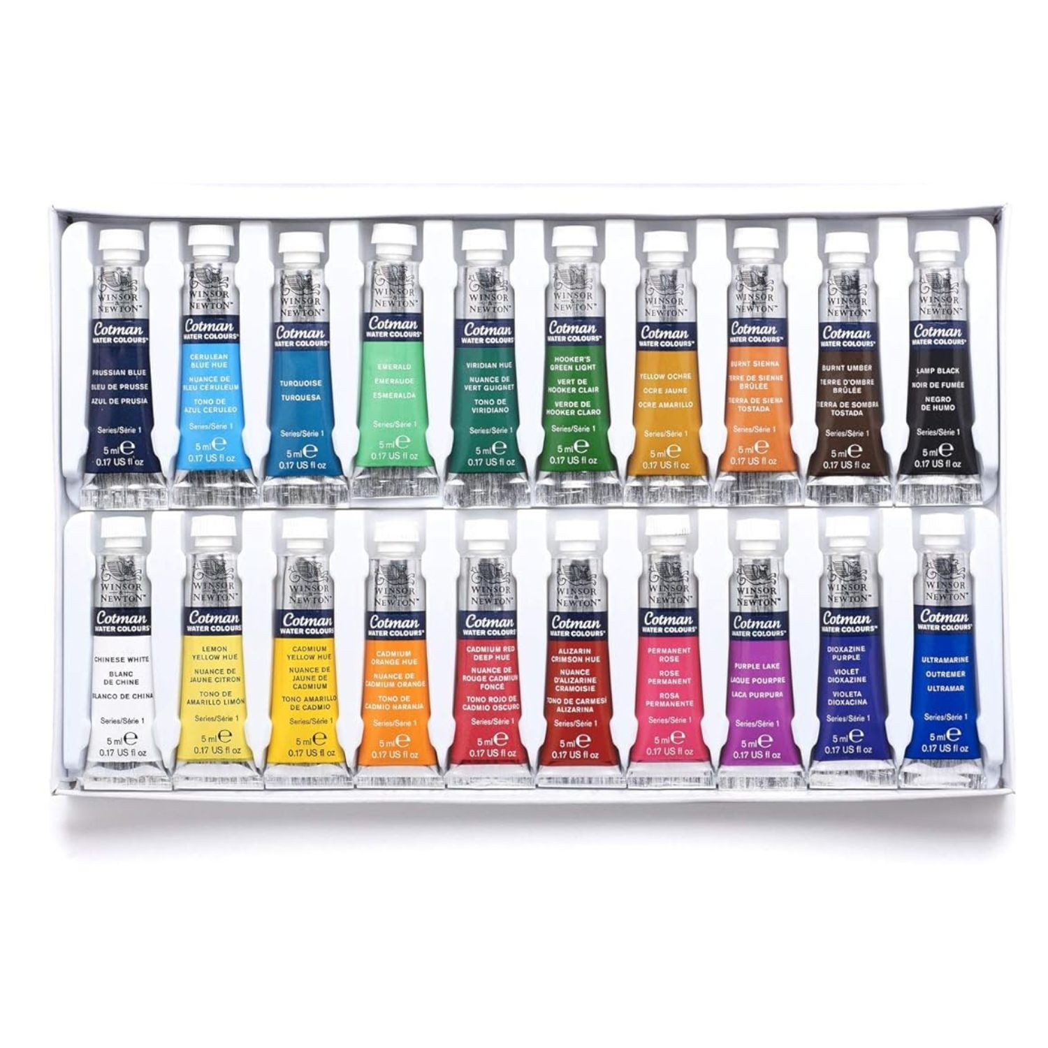 • 20 x 5ml Tubes - Chinese White, Lemon Yellow Hue, Cadmium Yellow Hue, Cadmium Orange Hue, Cadmium Red Deep Hue, Alizarin Crimson Hue, Permanent Rose, Purple Lake, Dioxazine Purple, Ultramarine, Prussian Blue, Cerulean Blue Hue, Turquoise, Emerald, Viridian Hue, Hooker's Green Light, Yellow Ochre, Burnt Sienna, Burnt Umber, and Lamp Black. (Subject to change)