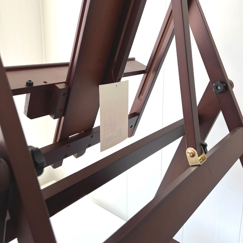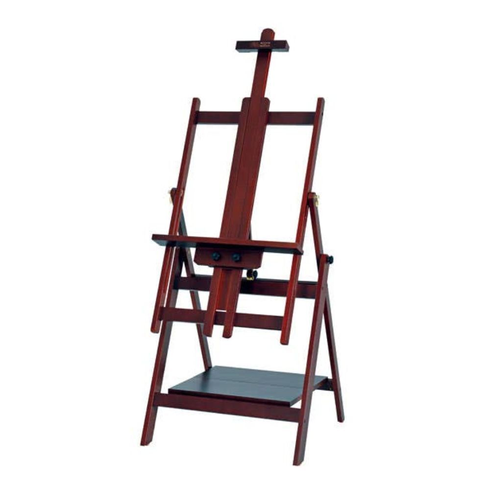 The Winsor & Newton Mahogany Hamilton Studio Easel is handcrafted from seasoned Beechwood with a Deep Mahogany stain and designed for watercolour, pastel, or oil painting. It tilts forward for glare reduction for painting and tilts backward to form a table for watercolours or to apply gesso/varnish.